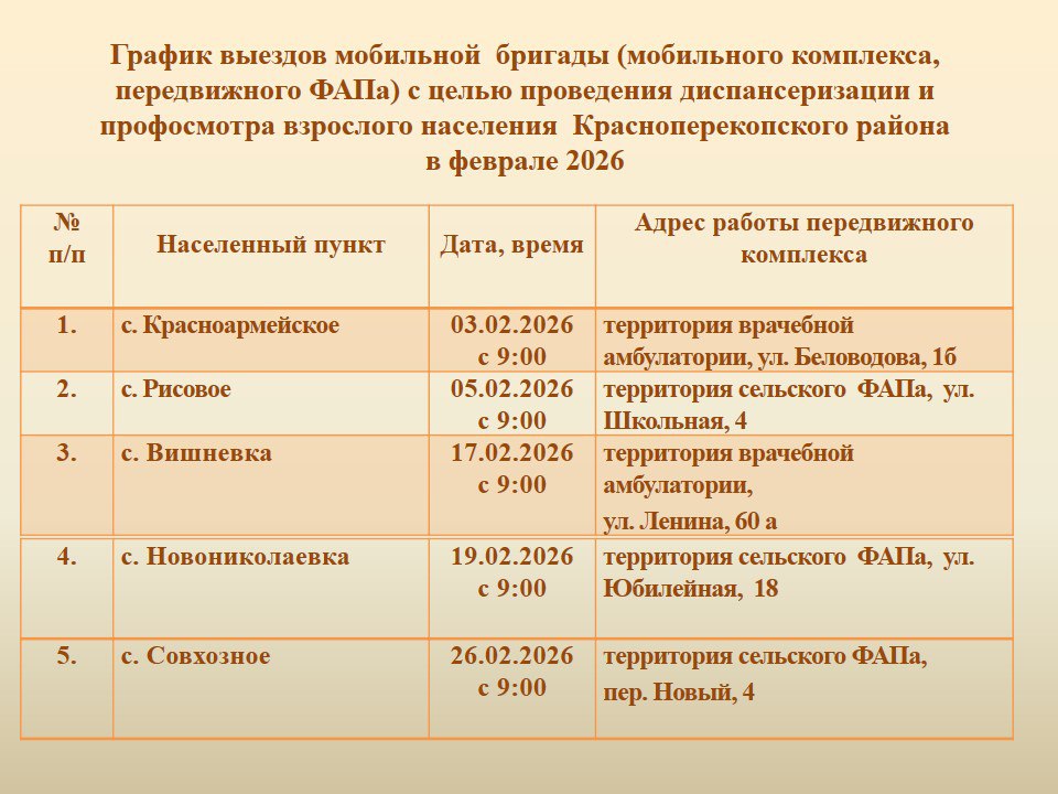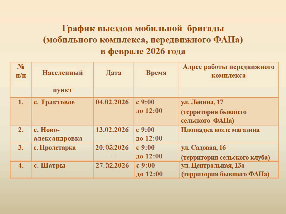 График выездов мобильной бригады (мобильного комплекса, передвижного ФАПа) на февраль 2026 года