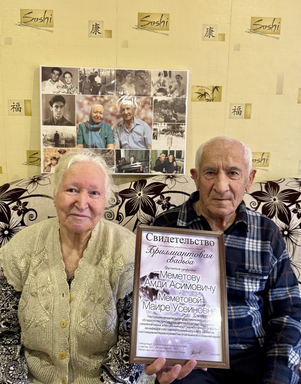 Красногвардейский районный отдел ЗАГС с особым почётом посетил юбиляров «бриллиантовой» свадьбы — супругов Амди Асимовича и Маире Усейновну Меметовых, чей семейный союз был заключён 27 января 1966 года. Супруги отмечают знаменательную дату — 60 лет совместной жизни, ставшую символом верности, терпения и истинной семейной мудрости.