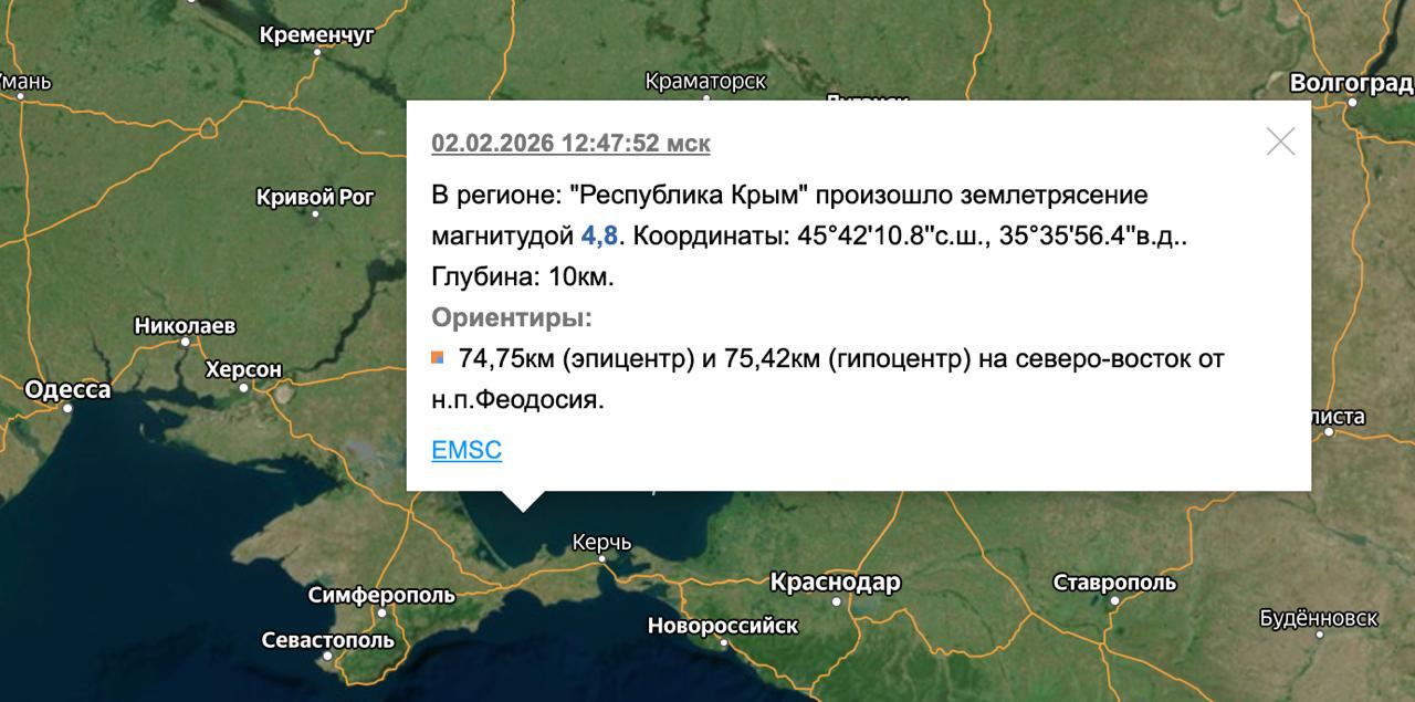 В восточном Крыму и акватории Азовского моря произошло землетрясение магнитудой 4,8 — службы мониторинга