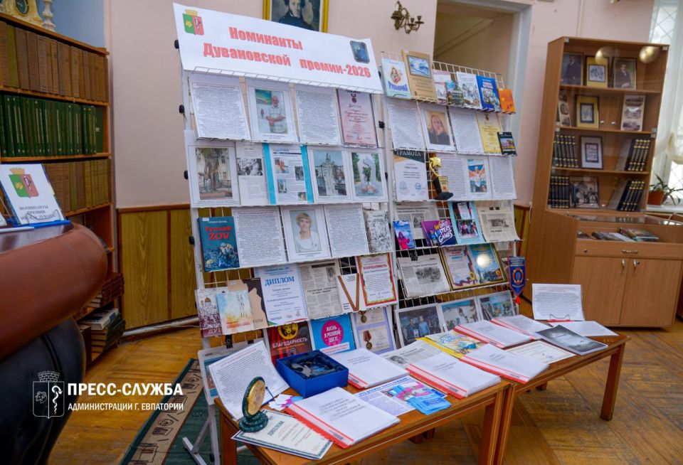 В читальном зале библиотеки им. А. С. Пушкина проходит выставка, посвященная номинантам городской премии им. С. Э. Дувана. Экспозиция включает информационные материалы и фотографии, демонстрирующие значительный вклад кандидатов в развитие города.