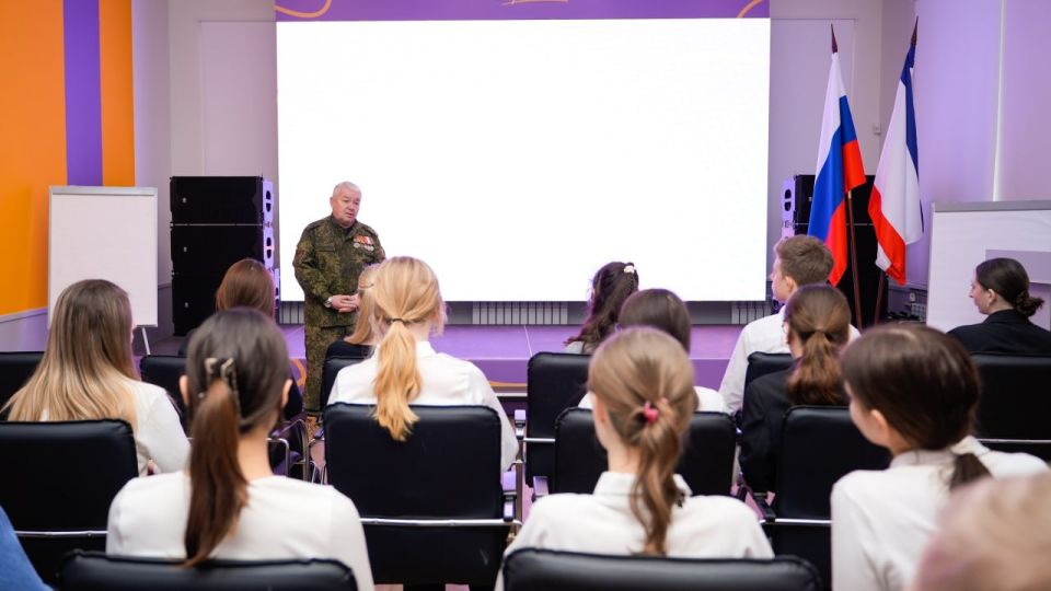 Ребята пообщались с Олегом Евгеньевичем Кораблевым — добровольцем, участником специальной военной операции, руководителем ассоциации ветеранов СВО по Симферополю и Симферопольскому району, заместителем атамана станицы Терская.