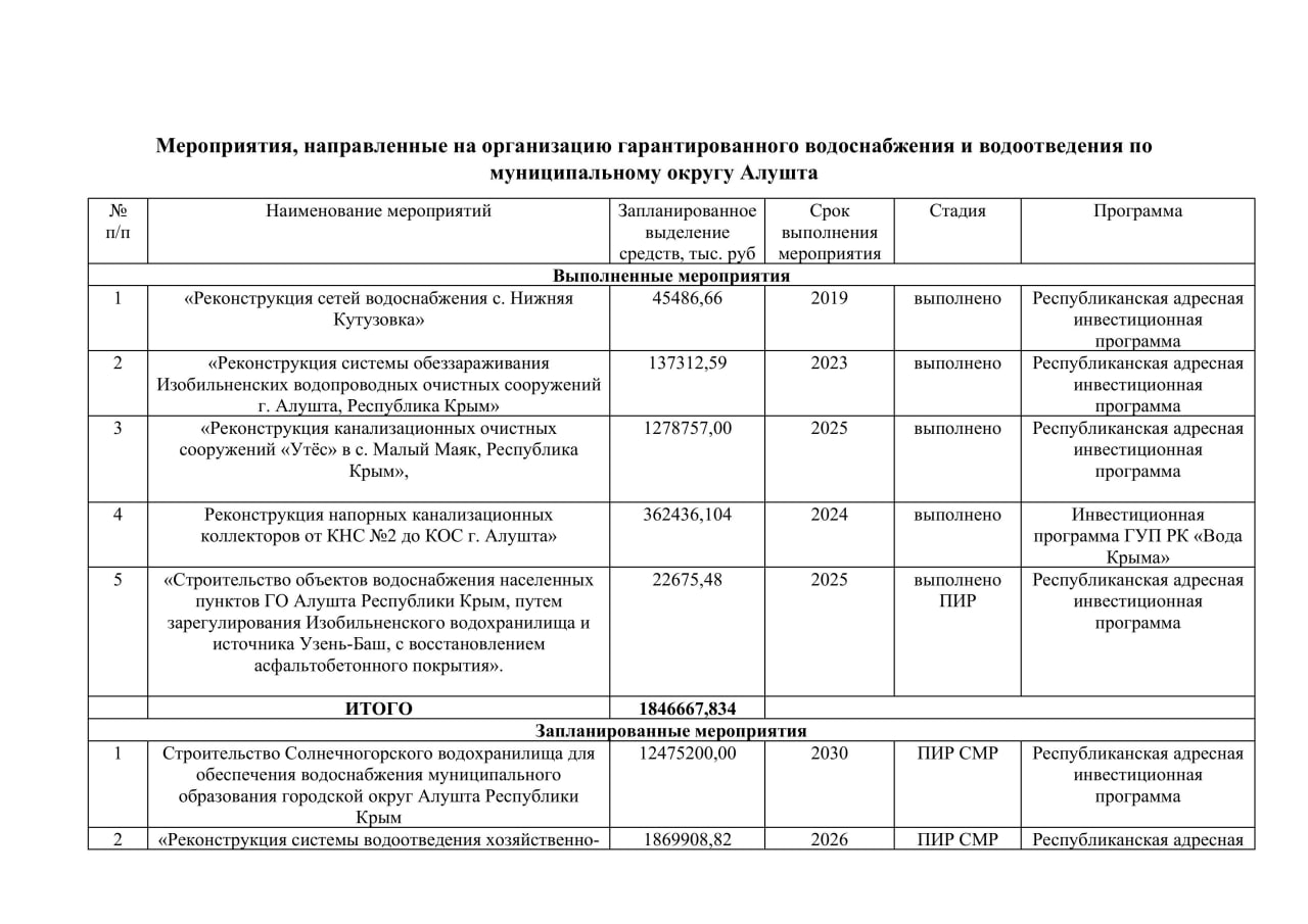 Предлагаем ознакомиться с комплексом мер, предпринимаемых ГУП РК «Вода Крыма», и объёмом выделенных средств на организацию гарантированного водоснабжения и водоотведения в муниципальном округе Алушта.