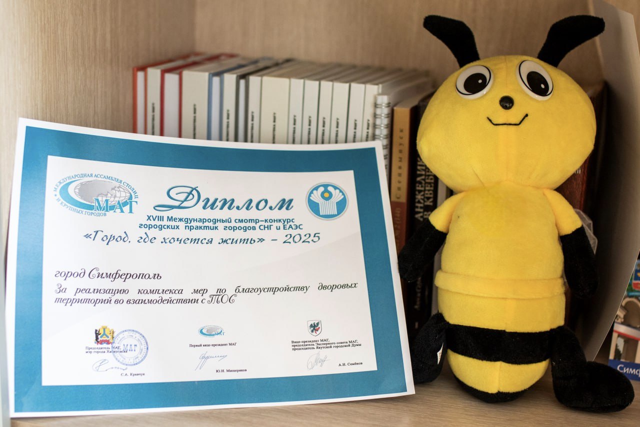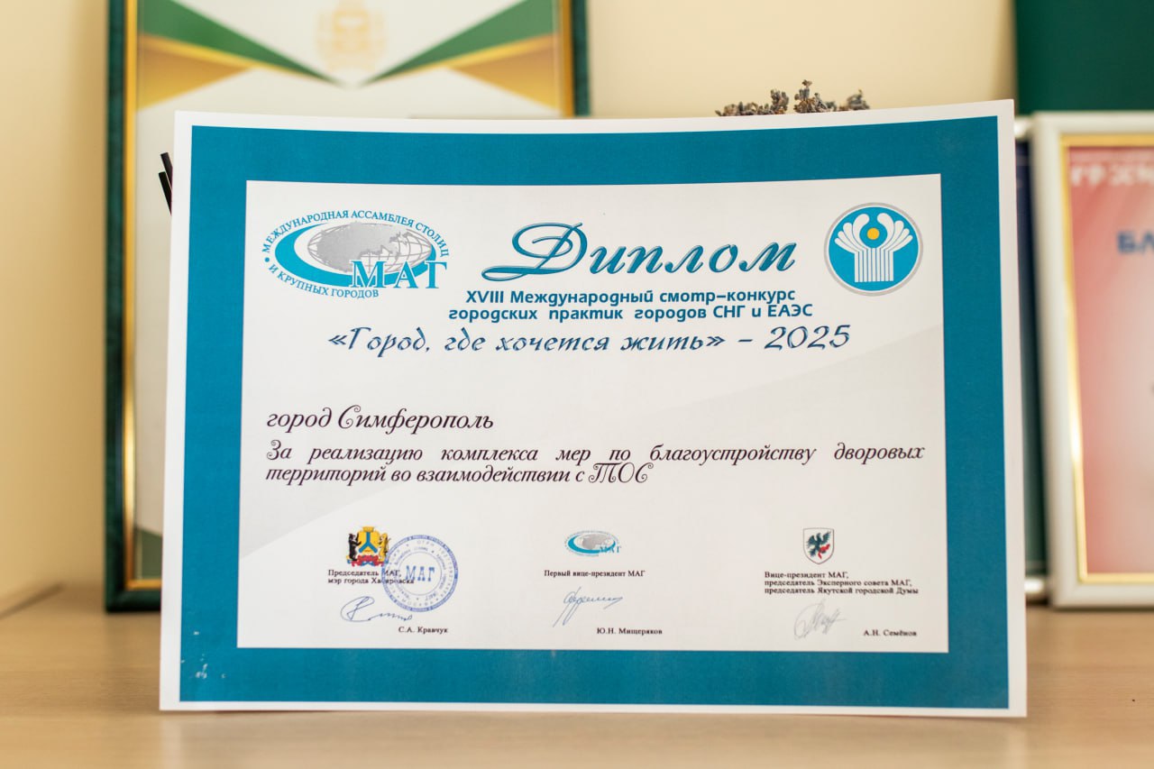 Город Симферополь отмечен дипломом XVIII Международного смотра-конкурса городских практик городов СНГ и ЕАЭС «Город, где хочется жить». Награда присуждена за реализацию комплекса мер по благоустройству дворовых территорий во взаимодействии с территориальными общественными самоуправлениями.