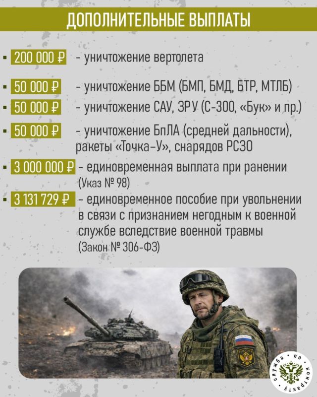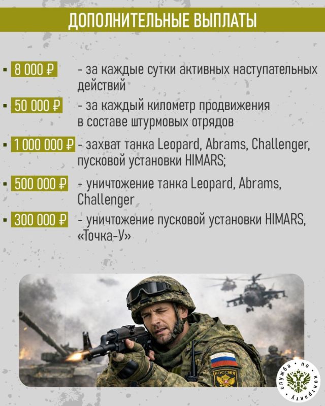 Также за службу в зоне специальной военной операции ежемесячно будет выплачиваться от 210 тысяч рублей (в зависимости от воинского звания, должности и выслуги лет).