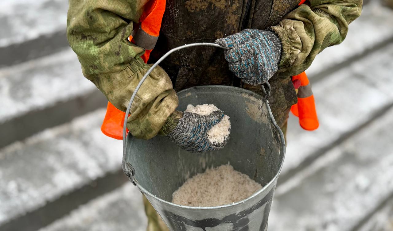 Не забывают и о самых рискованных местах — все ступеньки, мостики и подъёмы под особым контролем. Параллельно идёт уборка снега с дорожек и уличной мебели.