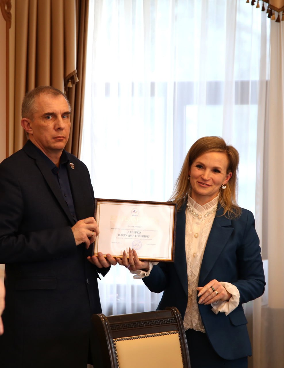 Завершилось заседание внеочередной сессии на приятной ноте – труд депутата городского совета Олега Даперко отметили благодарностью от Всероссийской ассоциации развития местного самоуправления (ВАРМСУ). Благодарность от ассоциации за заслуги в развитии местного самоуправления вручила председатель горсовета Ольга Кулинченко.