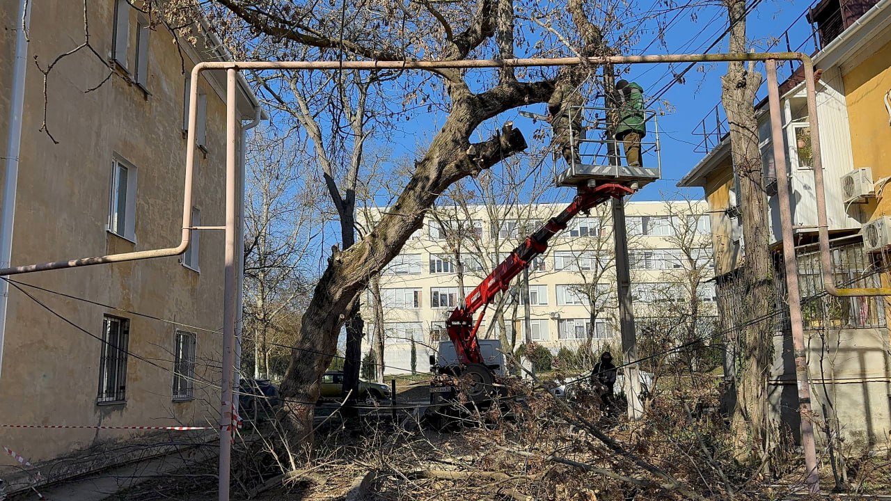Сегодня работы ведутся во дворе по ул. Студенческой, 2, 4. Местные жители обратились с просьбой снести аварийное дерево. Еще два зеленых насаждения нуждались в кронировании и санитарной обрезке. Для обеспечения безопасности предварительно специалисты КРЭС обесточили провода в районе проведения работ.