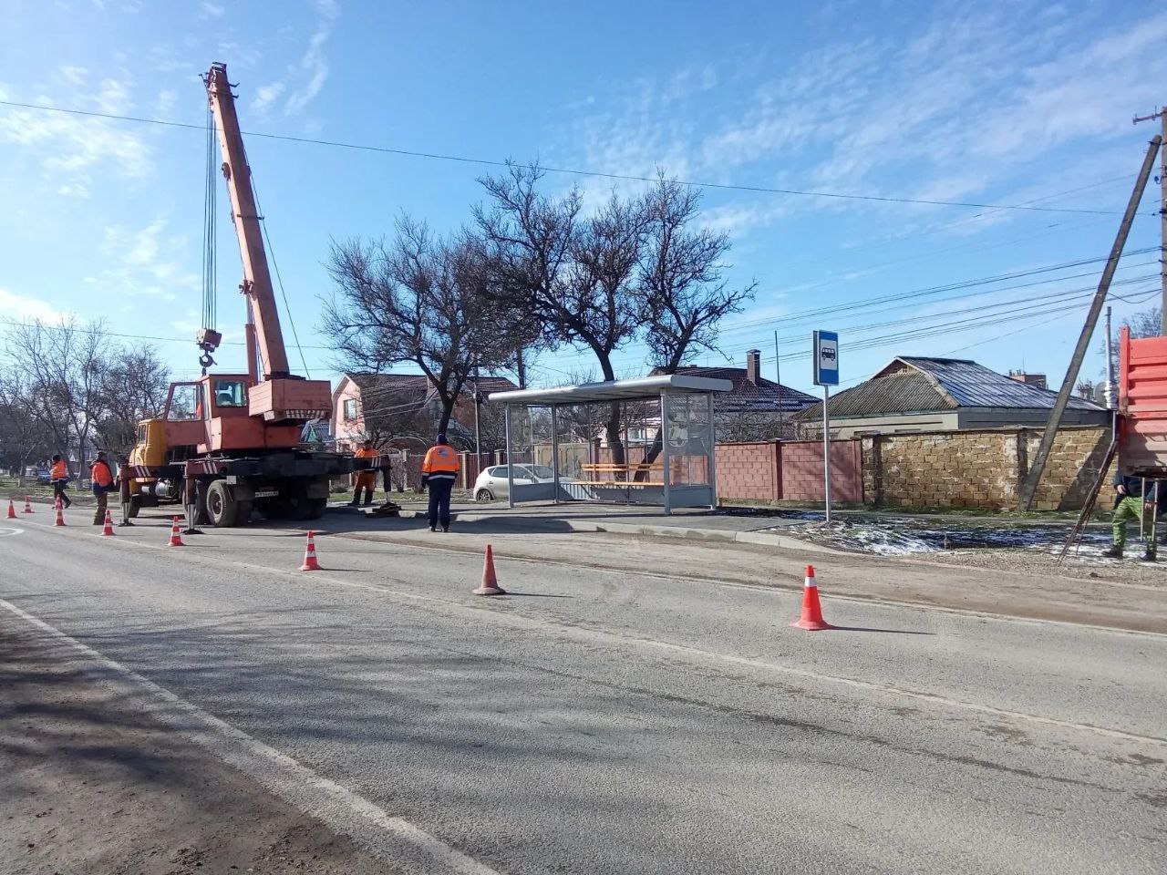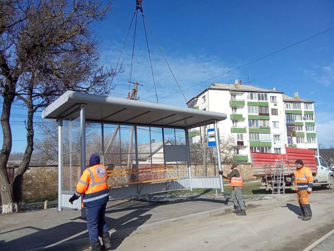 Сегодня специалистами "Красногвардейского ДРСУ" были установлены новые остановочные павильоны в пгт Красногвардейское на а/д Красногвардейское – Новоекатериновка, км 0+110.