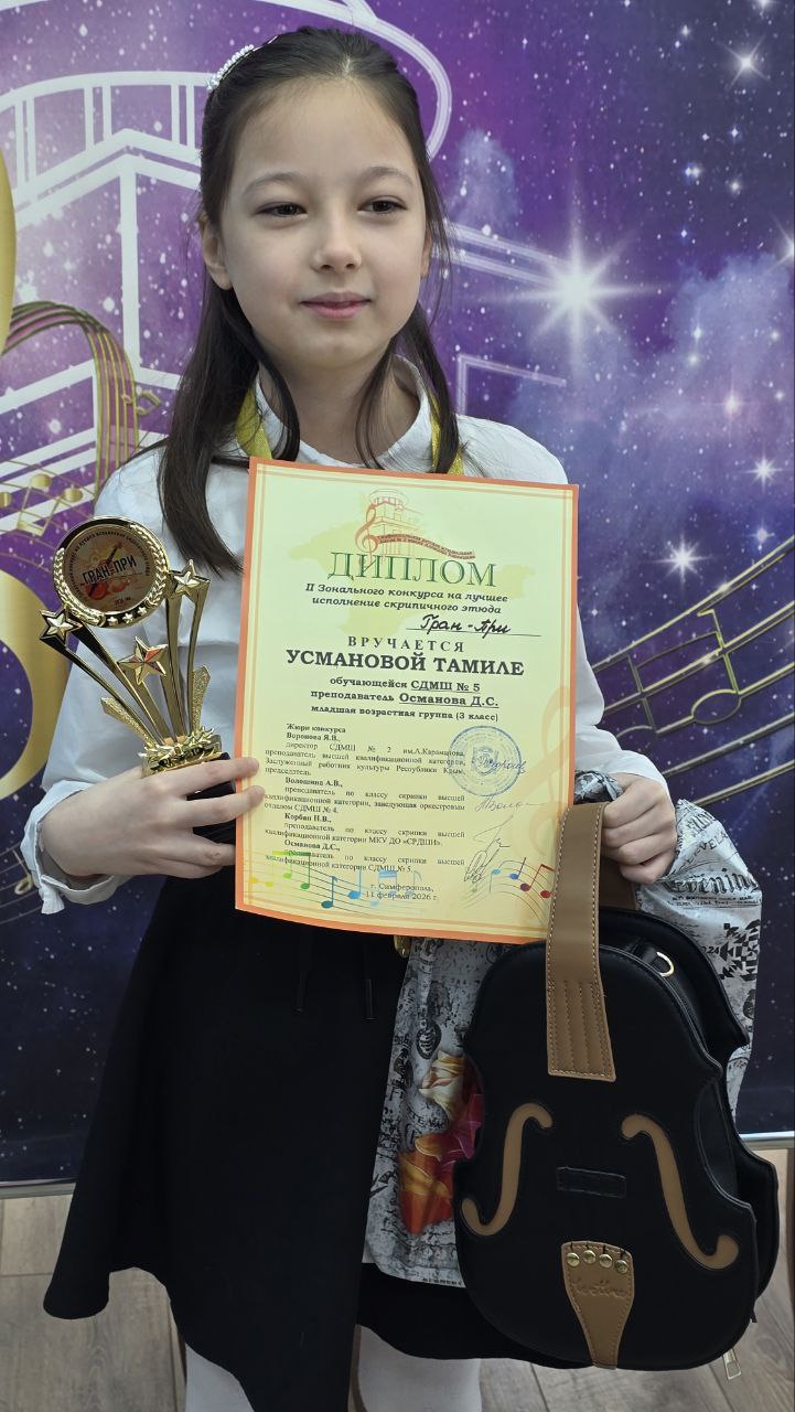 По итогам проведения конкурса Гран-При было присуждено обучающейся СДМШ № 5 Усмановой Тамиле (преподаватель Османова Д.С.).