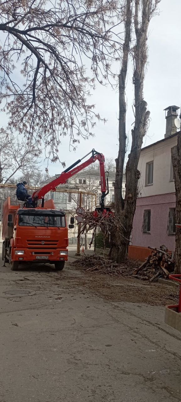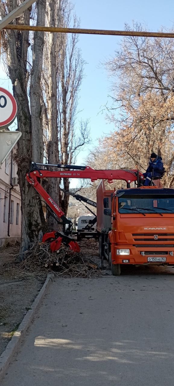 Также начата санитарная обрезка деревьев с погрузкой и вывозом обрезанных веток. Работа проводилась на улицах Красноармейская и Ленина, на Симферопольское шоссе.
