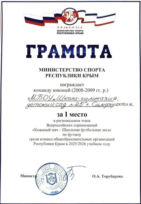 Команда юношей МБОУ «Школа-гимназия, детский сад № 25» достойно представила город Симферополь, заняв ПЕРВОЕ место в Региональном этапе Всероссийских соревнований «Кожаный мяч – Школьная футбольная лига» по футзалу!