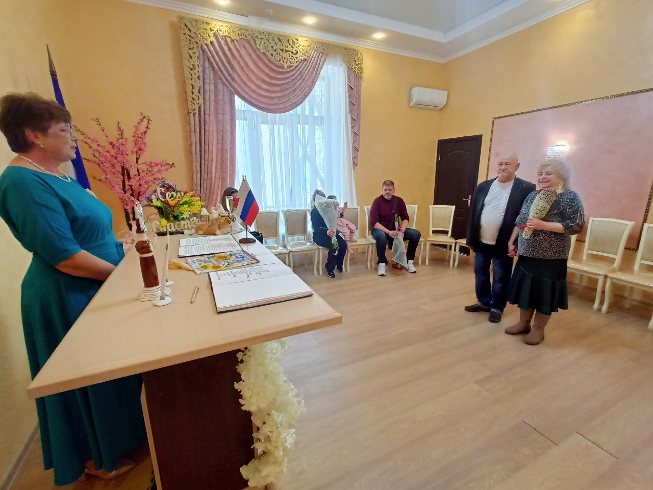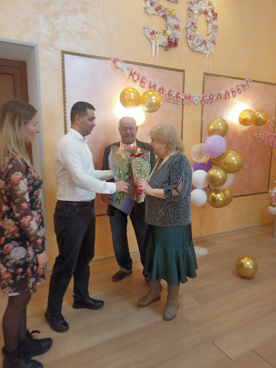 Традиционно юбиляров поздравили и молодожены, которые в этот день также создавали свою семью. Надежда Валентиновна с большой теплотой поделилась с ними секретами сохранения семейного тепла, традиций и простого семейного счастья. Поздравления от таких мудрых и любящих людей – это бесценный дар, напоминающий о важности ценить друг друга и жить в заботе и любви.