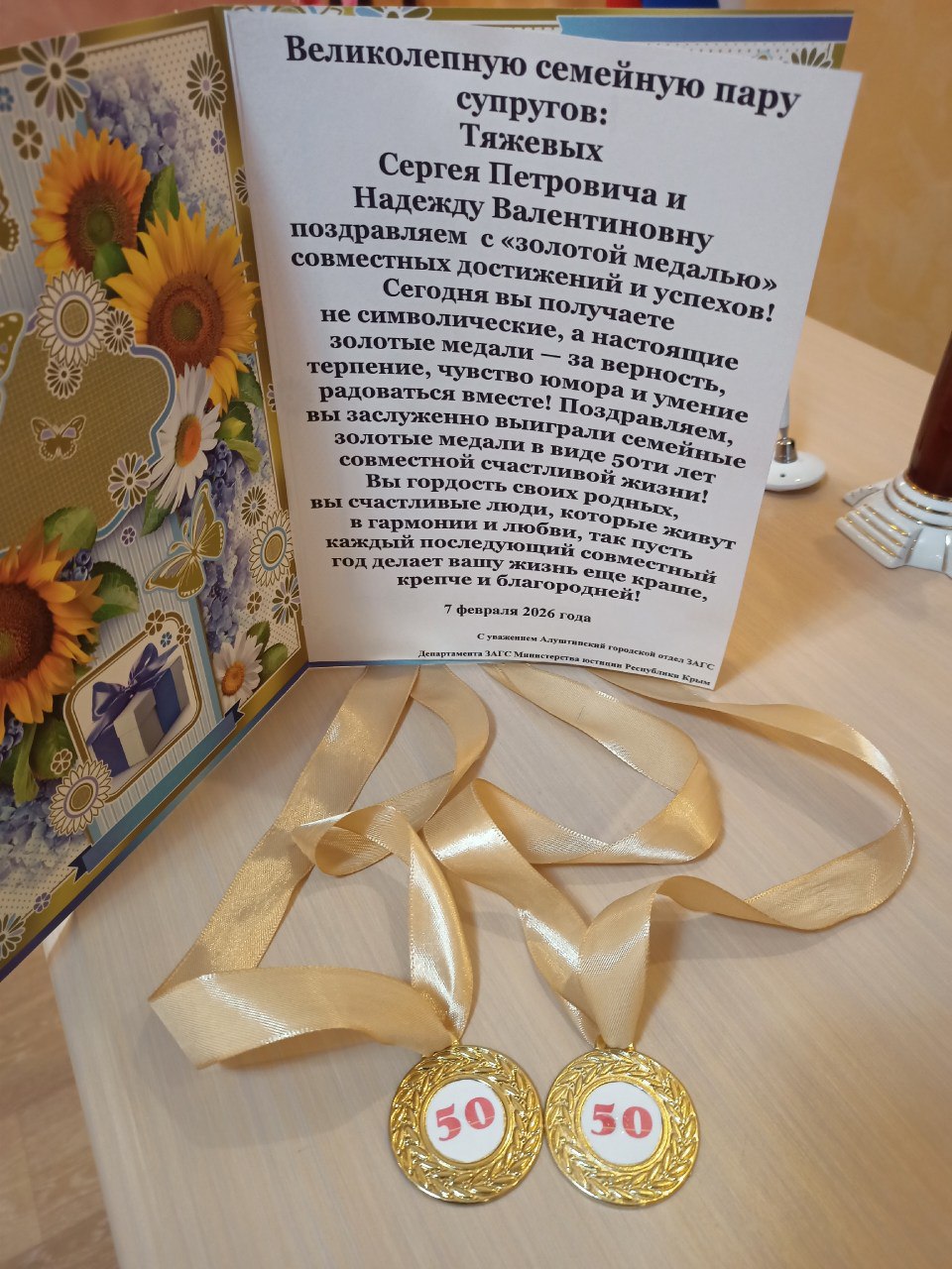 Специалисты Алуштинского отдела ЗАГС с особой теплотой провели обряд «золотой свадьбы» для супругов Тяжевых. Юбилярам были вручены символические «золотые медали» за верность, терпение, чувство юмора и умение радоваться жизни вместе.