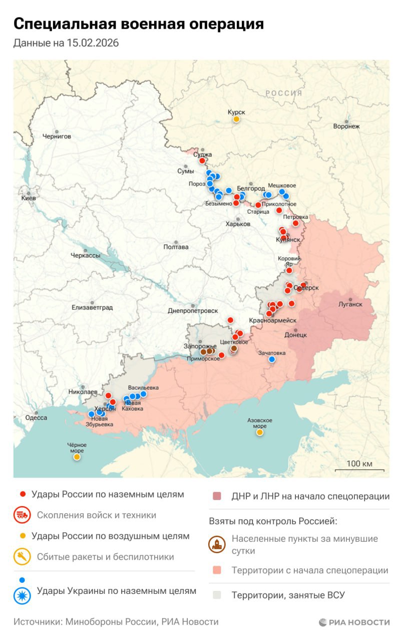 Массированные пуски БПЛА противника идут со вчерашнего вечера. Минобороны России:С 23.00 мск 14 февраля до 7.00 мск 15 февраля уничтожено 68 украинских БПЛА самолетного типа над акваторией Азовского моря, территориями Краснодарского края...