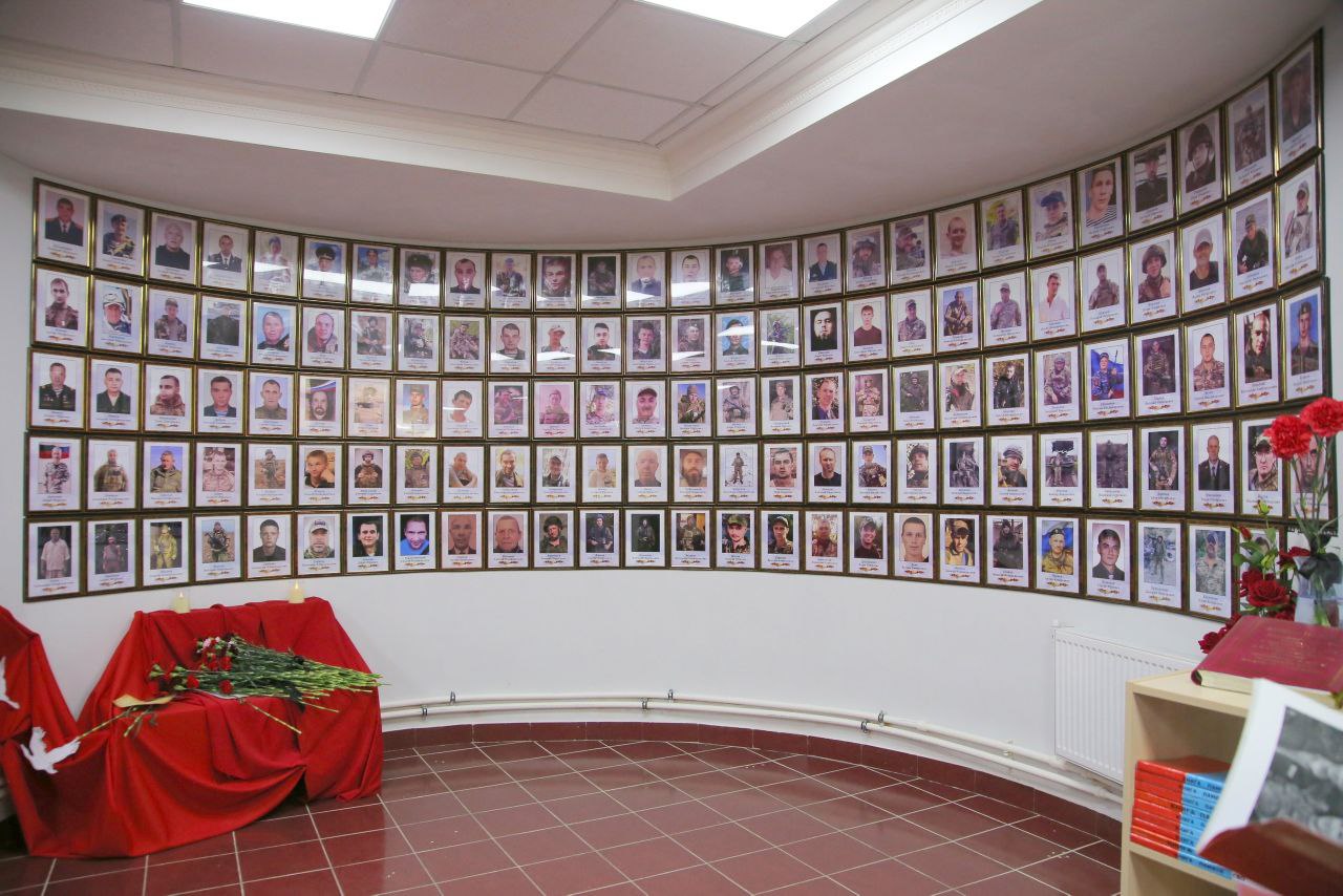 Экспозиция зала включает фотографии и личные вещи погибших участников СВО - экспонаты, хранящие память о героях, отдавших жизнь за наше будущее; военное снаряжение, элементы экипировки и вооружения, переданные действующими военнослужащими; изделия волонтёров: тактические браслеты, маскировочное снаряжение, окопные свечи.