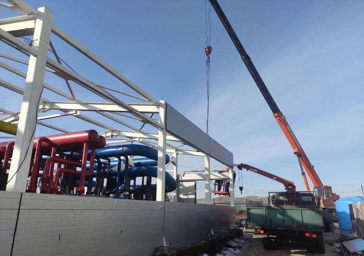 Сейчас на строительной площадке выполняется монтаж котельного оборудования: котлов, внутреннего трубопровода, насосов сетевых, исходной воды, циркуляционных и подпиточных. Ведётся монтаж дымовой трубы, тепловых сетей и сетей водоснабжения и водоотведения. Также монтируется каркас здания.