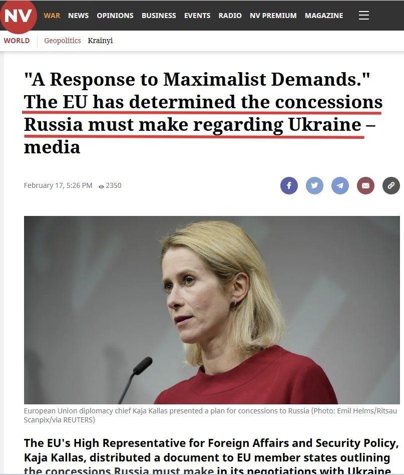 Глава Евродипломатии Кая Каллас распространила среди государств-членов ЕС свой "мирный план", который требует от России капитуляции.