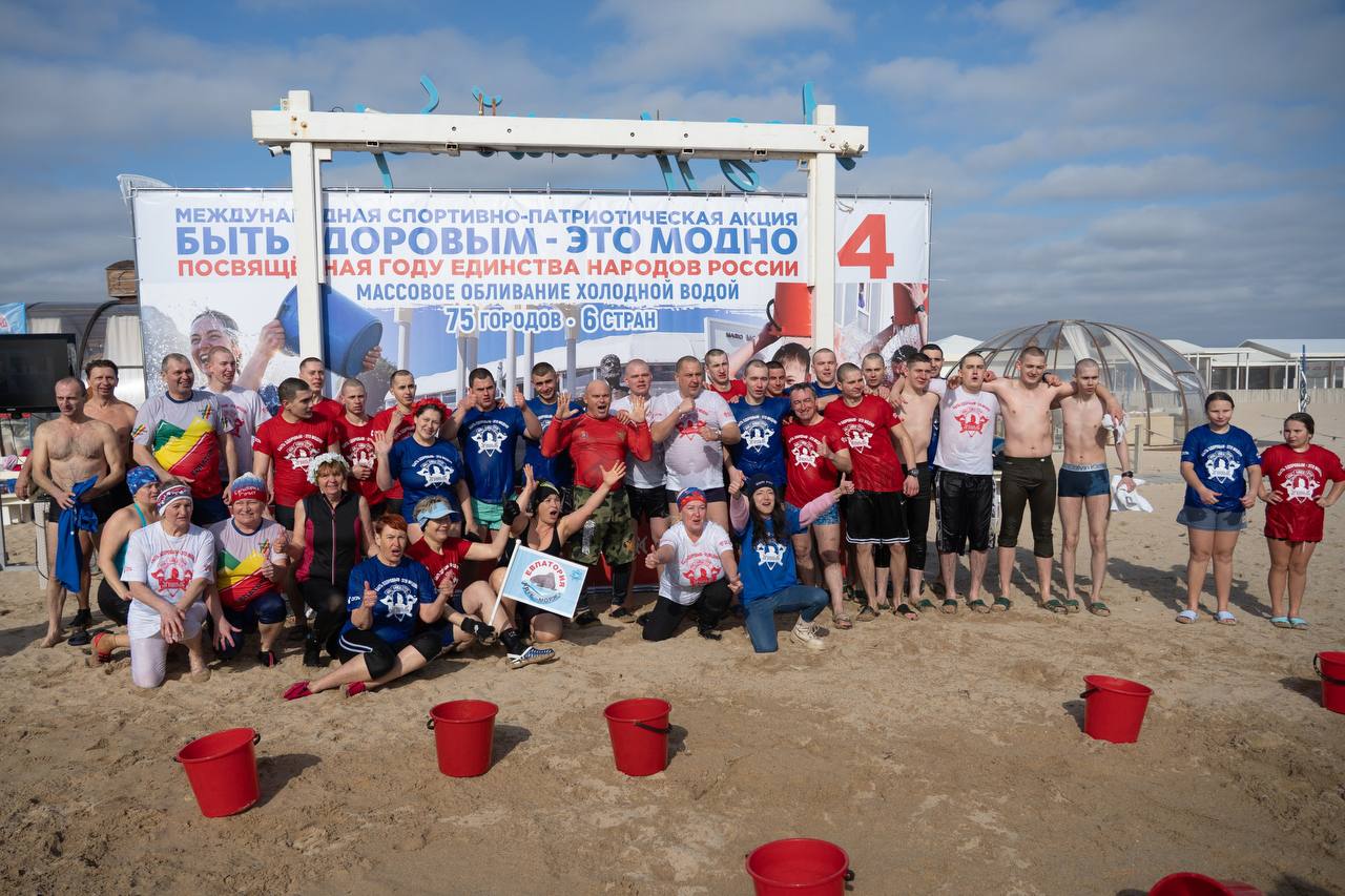 Приверженцы здорового образа жизни сначала выполнили разминку, потом приступили к обливанию, после чего искупались в зимнем море.