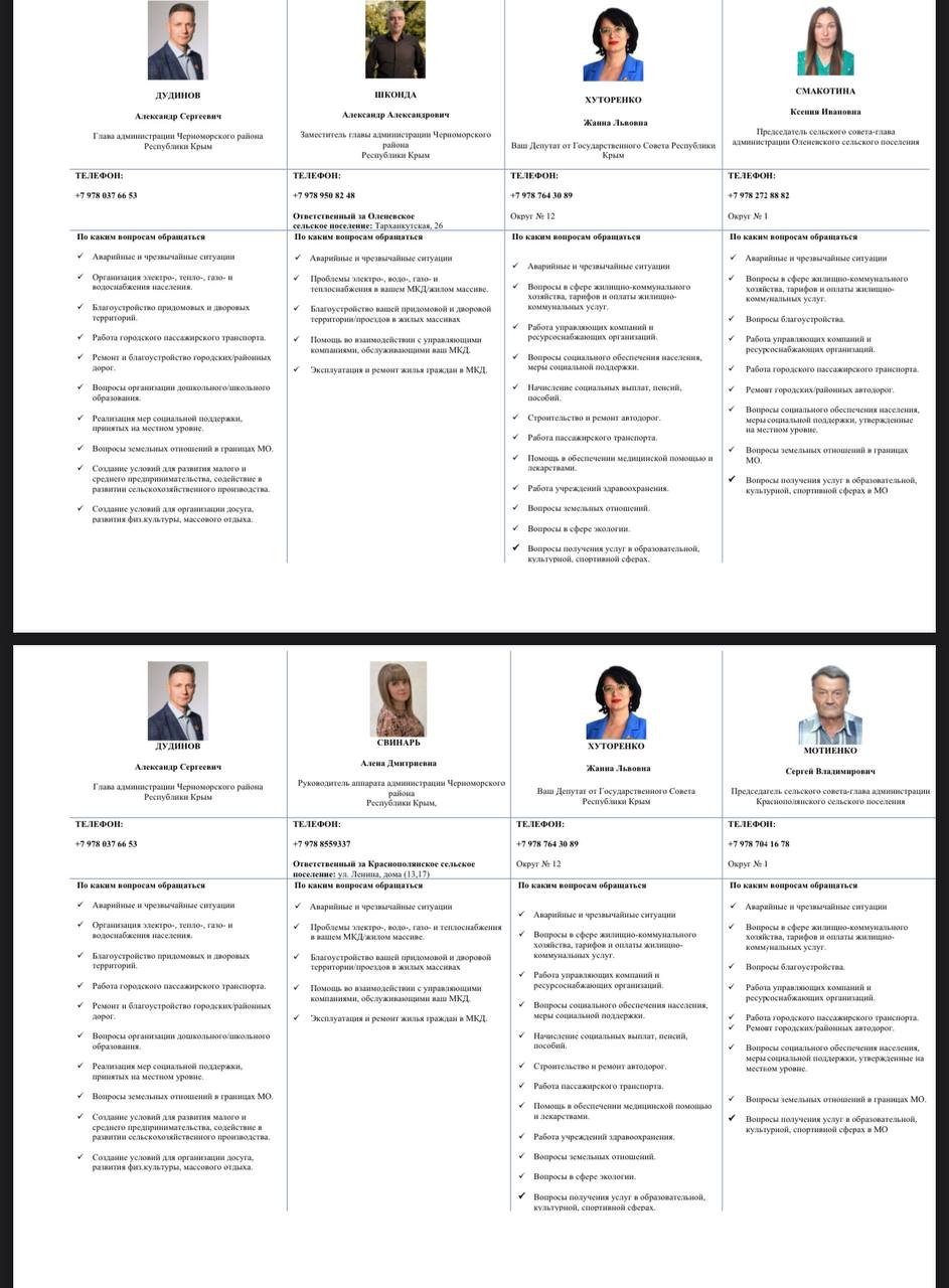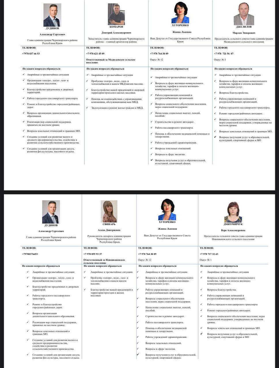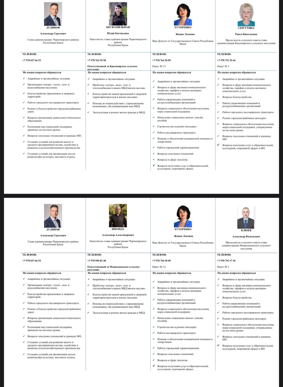 В посте оставляю мои личные контактные данные, закрепленного за территорией моего заместителя, депутата Госсовета Крыма Жанны Хуторенко и глав администраций сельских поселений. В прикрепленных файлах указан список вопросов, с которыми вы можете обратиться к представителям власти.
