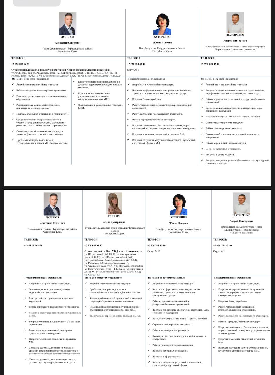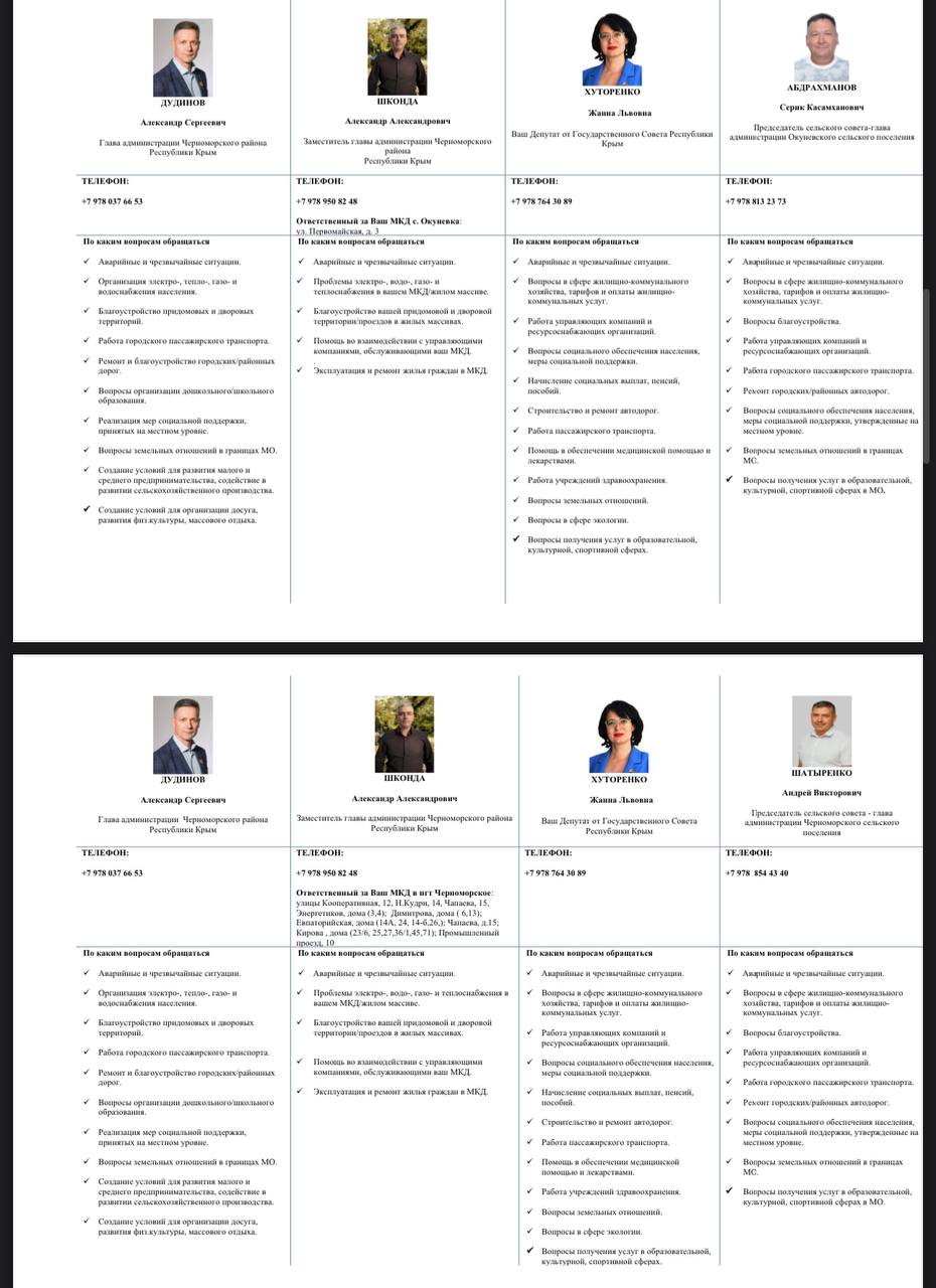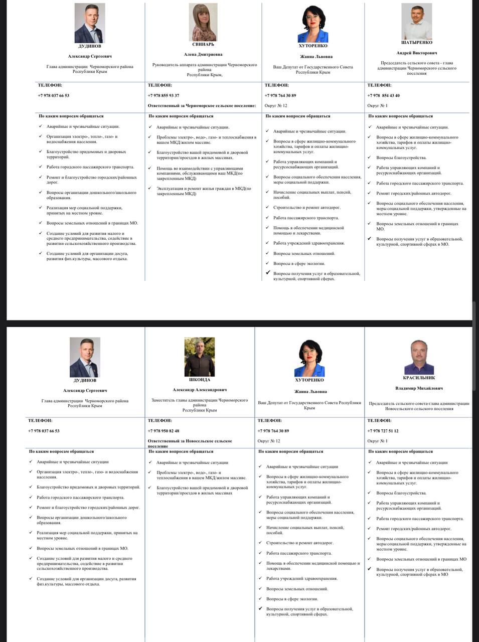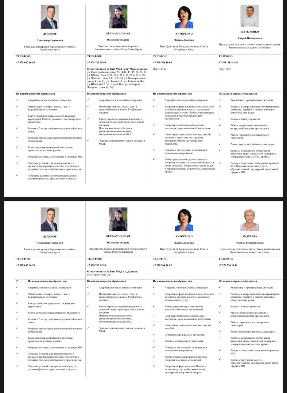 В посте оставляю мои личные контактные данные, закрепленного за территорией моего заместителя, депутата Госсовета Крыма Жанны Хуторенко и глав администраций сельских поселений. В прикрепленных файлах указан список вопросов, с которыми вы можете обратиться к представителям власти.