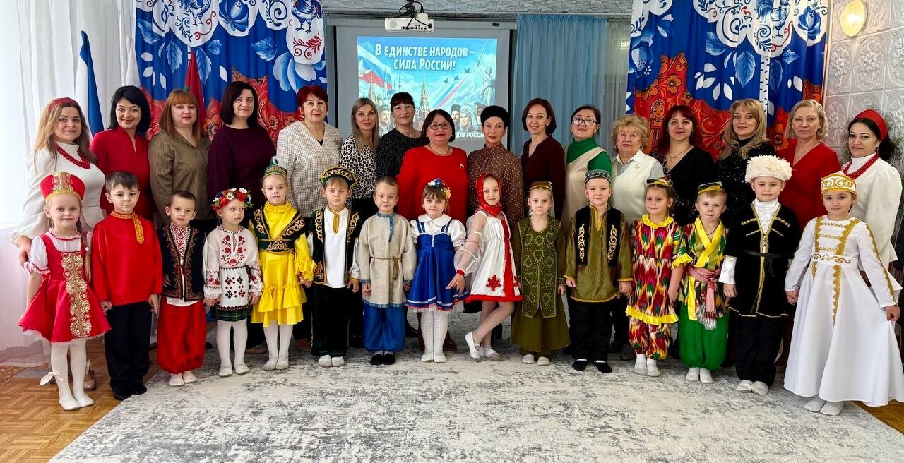 Первым старт дал детский сад "Березка". Воспитанники и педагоги подготовили яркое и содержательное мероприятие, посвященное значимости дружбы народов. Дети делились своими эмоциями, выражая любовь к Родине — многоликой и многонациональной России.
