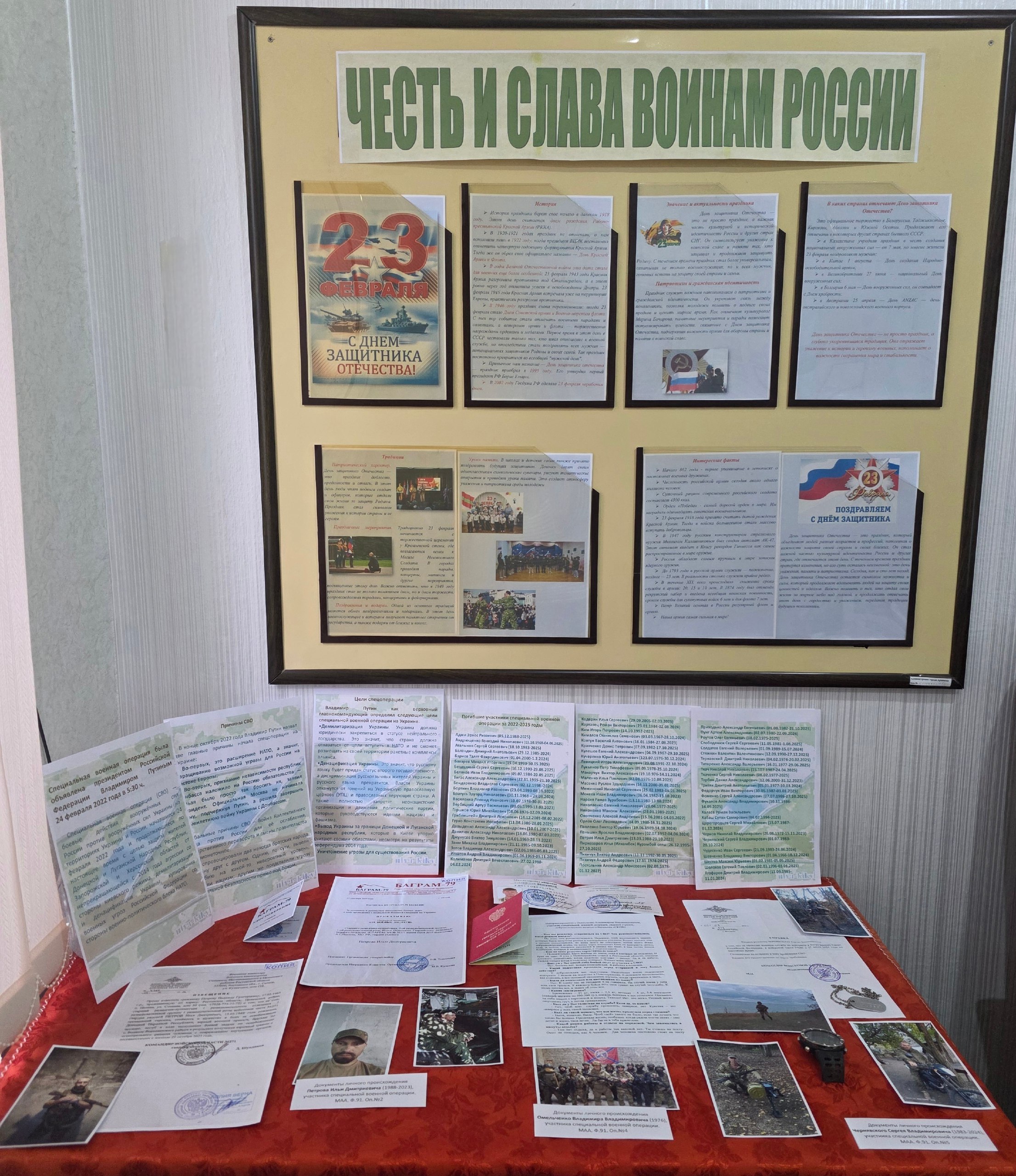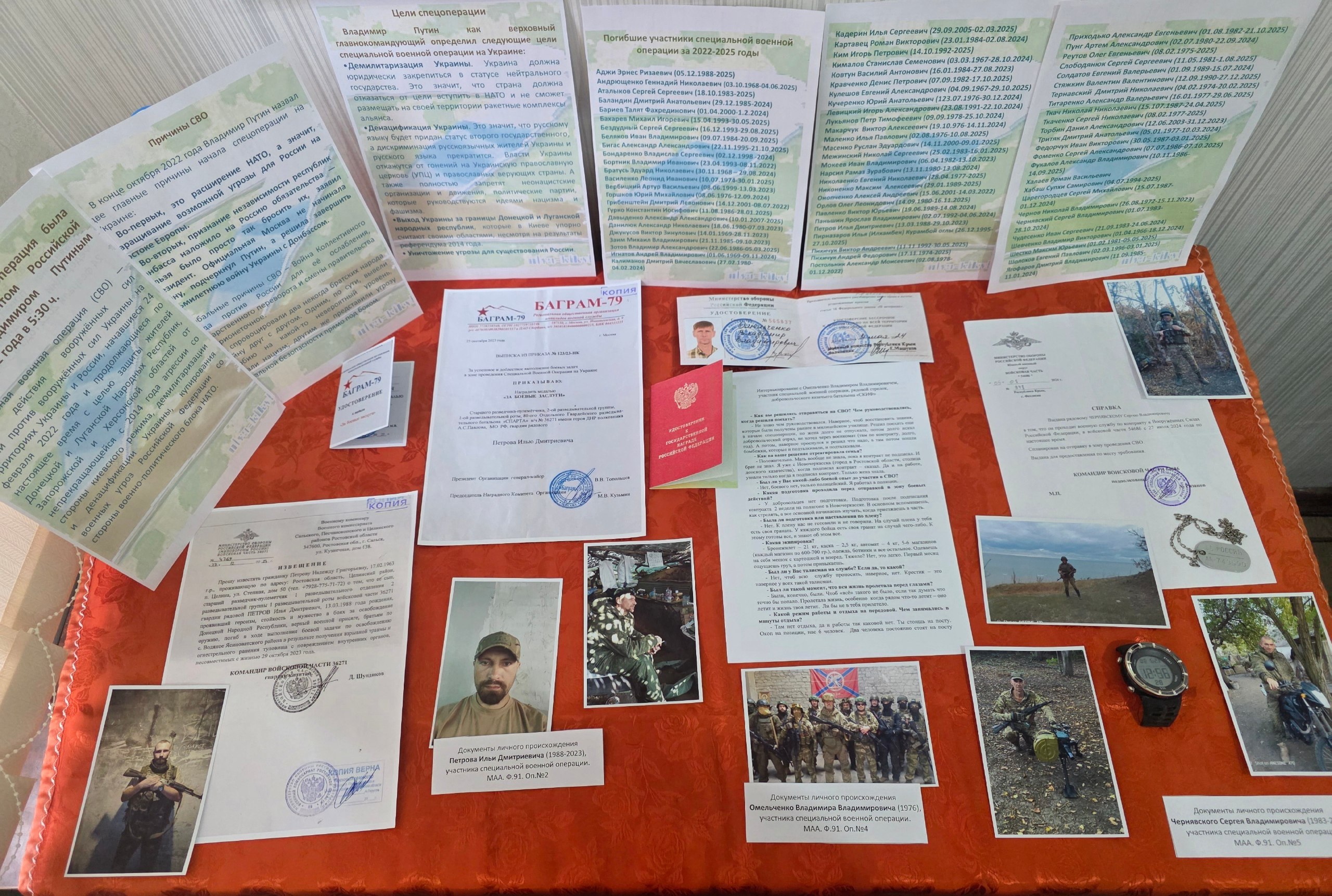 На выставке представлены документы личного происхождения участников СВО – Ильи Петрова, Сергея Чернявского и Владимира Омельченко. В экспозицию вошли выписка из приказа о награждении медалью «За боевые заслуги» старшего разведчика-пулемётчика 2-й разведывательной группы 1-й разведывательной роты 80-го отдельного гвардейского разведывательного батальона «Спарта» Ильи Петрова за самоотверженность, мужество и отвагу, проявленные при выполнении боевых задач, а также извещение о его героической гибели; справка о прохождении воинской службы в зоне СВО Сергея Чернявского и его личные вещи – именной жетон и часы; интервью с участником СВО, рядовым стрелком добровольческого казачьего батальона «СКИФ» Владимиром Омельченко о прохождении воинской службы в районе Бахмуута Донецкой области и его наградные документы – удостоверение к медали «За отвагу».