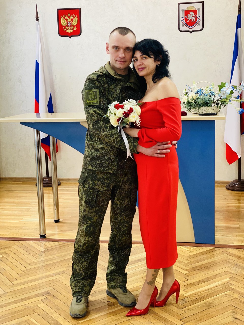 Познакомились они в г.Камышин Волгоградской области, куда на сборы был направлен Алексей. Гуляли, общались, смеялись. Через несколько дней Алексей был направлен на крымский полигон, с последующим убытием в зону боевых действий. Так и встречались урывками, когда Алексей приезжал ненадолго к своей возлюбленной. Невзирая на опасность, Ольга периодически также навещала своего будущего супруга в Херсонской области. О создании семьи они мечтали давно, и вот, в один из дней Алексей позвонил своей любимой и сказал срочно приехать в Феодосию и что её ждёт сюрприз. Алексей неординарный человек и сюрприз удался! Встретив свою любимую, он посадил её в такси и сказал: «едем выбирать платье». Ольга до последнего думала, что он поведет её в ресторан праздновать День защитника Отечества. Каково же было её удивление, когда Леша привел её в ЗАГС и здесь же сделал предложение. После подачи заявления, молодоженов тут же расписали.