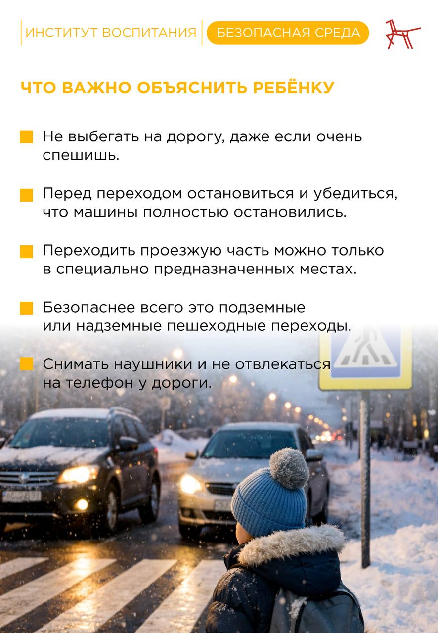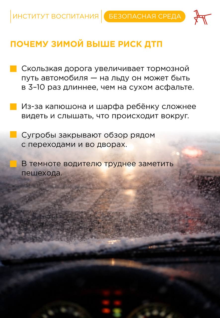 Зимой дорога становится значительно опаснее. Гололёд, ранние сумерки, сугробы у переходов и спешка делают путь в школу и домой более рискованным. Дети чаще падают, выбегают на проезжую часть и не успевают среагировать на машину.
