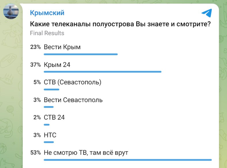 Согласно опросу в Telegram-чатах с общей аудиторией более 400 тысяч человек, лидером местного телевидения остаётся канал «Крым 24», набравший 37% голосов.