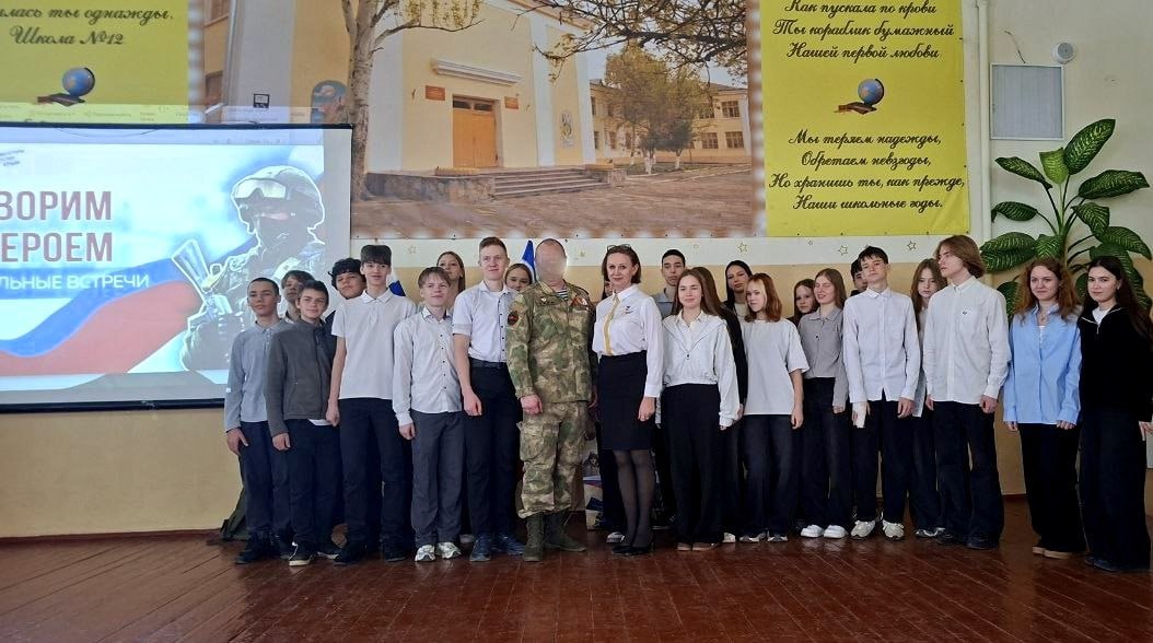 В МБОУ «СОШ №12 им. И. П. Крыжановского» прошла встреча старшеклассников с участником СВО, заместителем командира взвода мотострелкового батальона 126 отдельной бригады береговой обороны — позывной «Скиф».