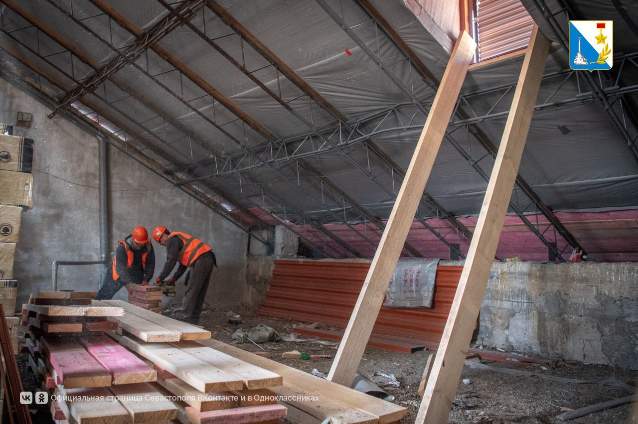Строители выполнили уже 90% работ. Площадь крыши — больше 1300 квадратных метров. Старый шифер демонтировали вместе с изношенными свесами, уложили новую обрешетку и гидроизоляцию.