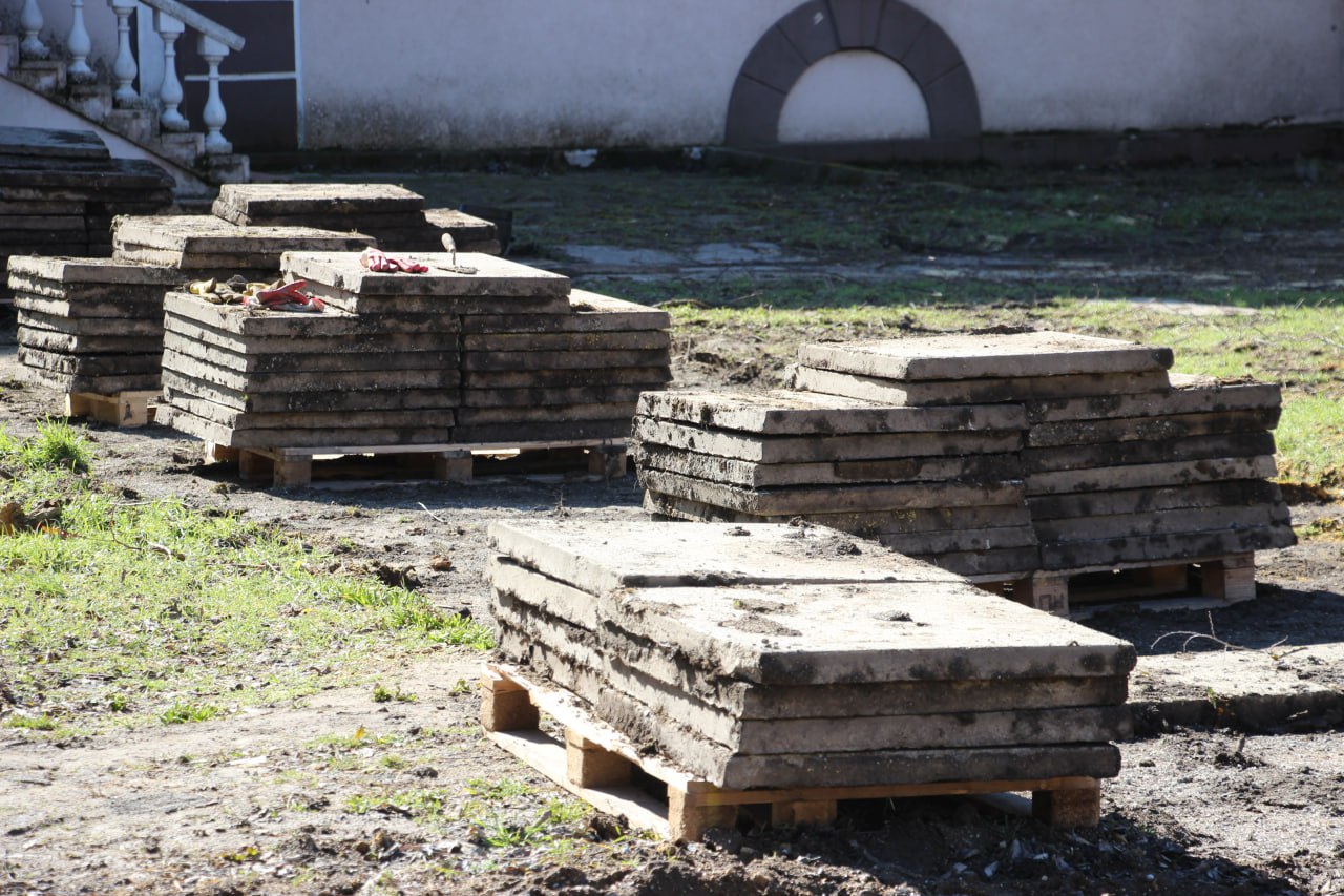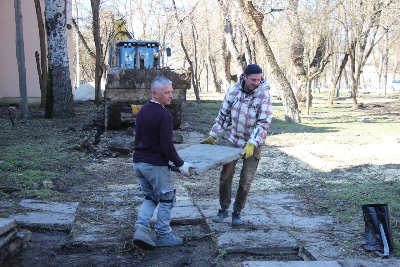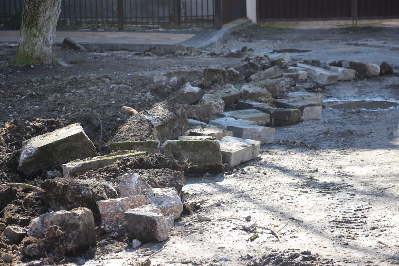 Строители приступили к демонтажу старой тротуарной плитки и бордюров по стороне образовательного учреждения. Задействованы 5 человек и 1 единица техники.