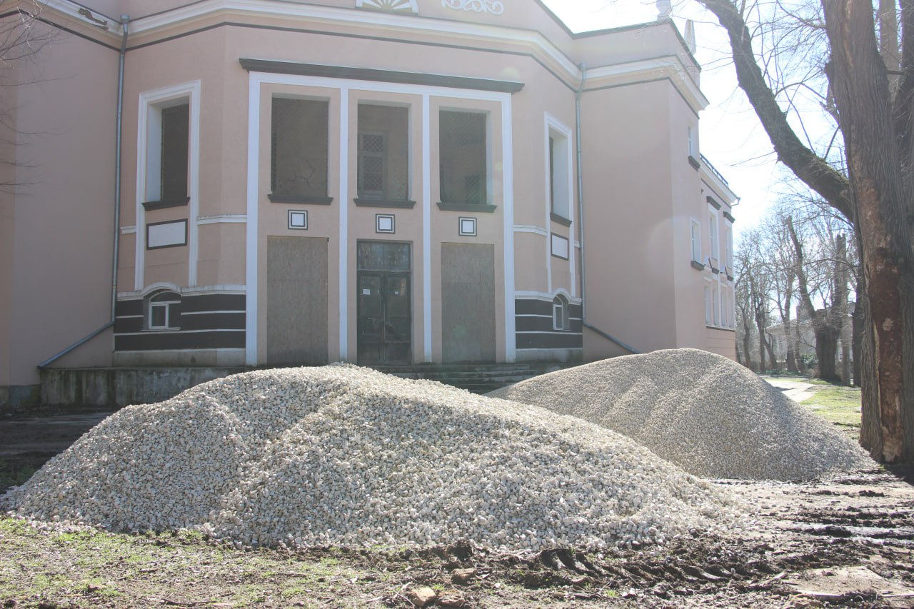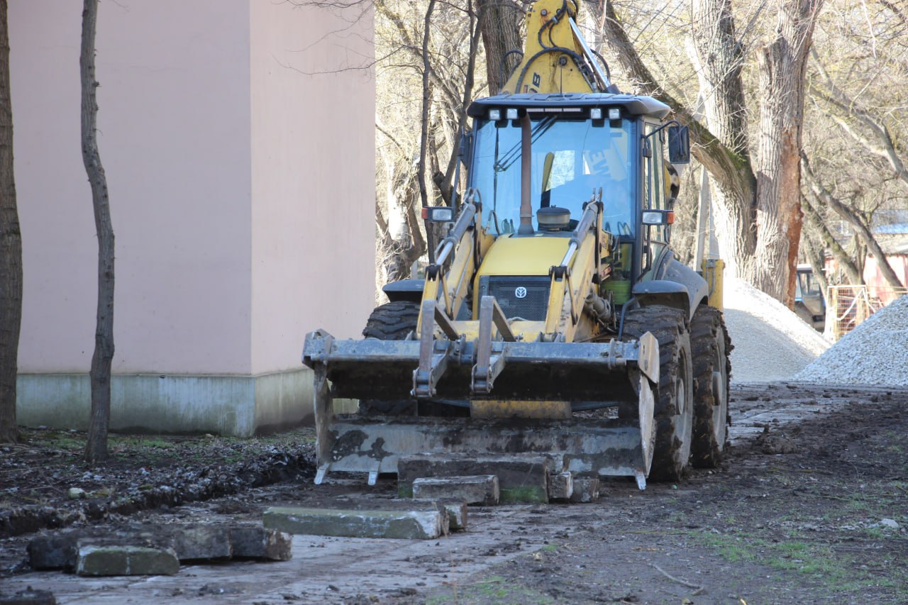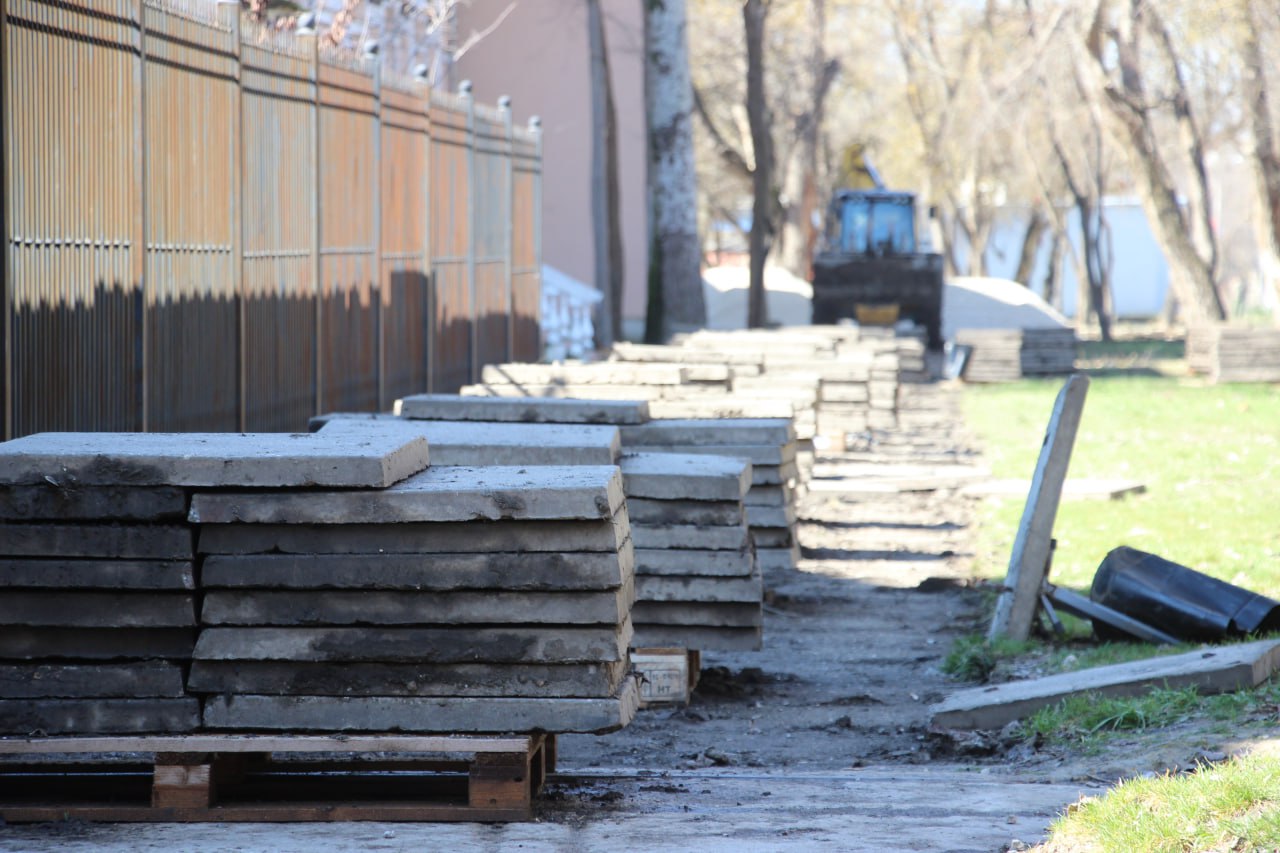 Строители приступили к демонтажу старой тротуарной плитки и бордюров по стороне образовательного учреждения. Задействованы 5 человек и 1 единица техники.