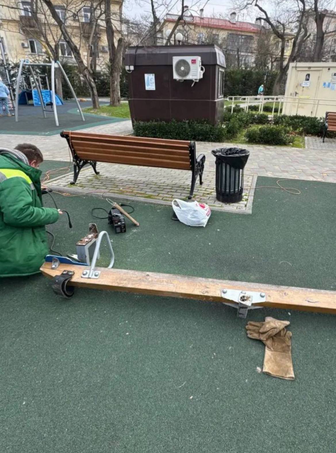 Специалисты «Парки и скверы» Севастополя мониторят состояние инвентаря на игровых площадках, а также выполняют ремонт и профилактические работы на постоянной основе