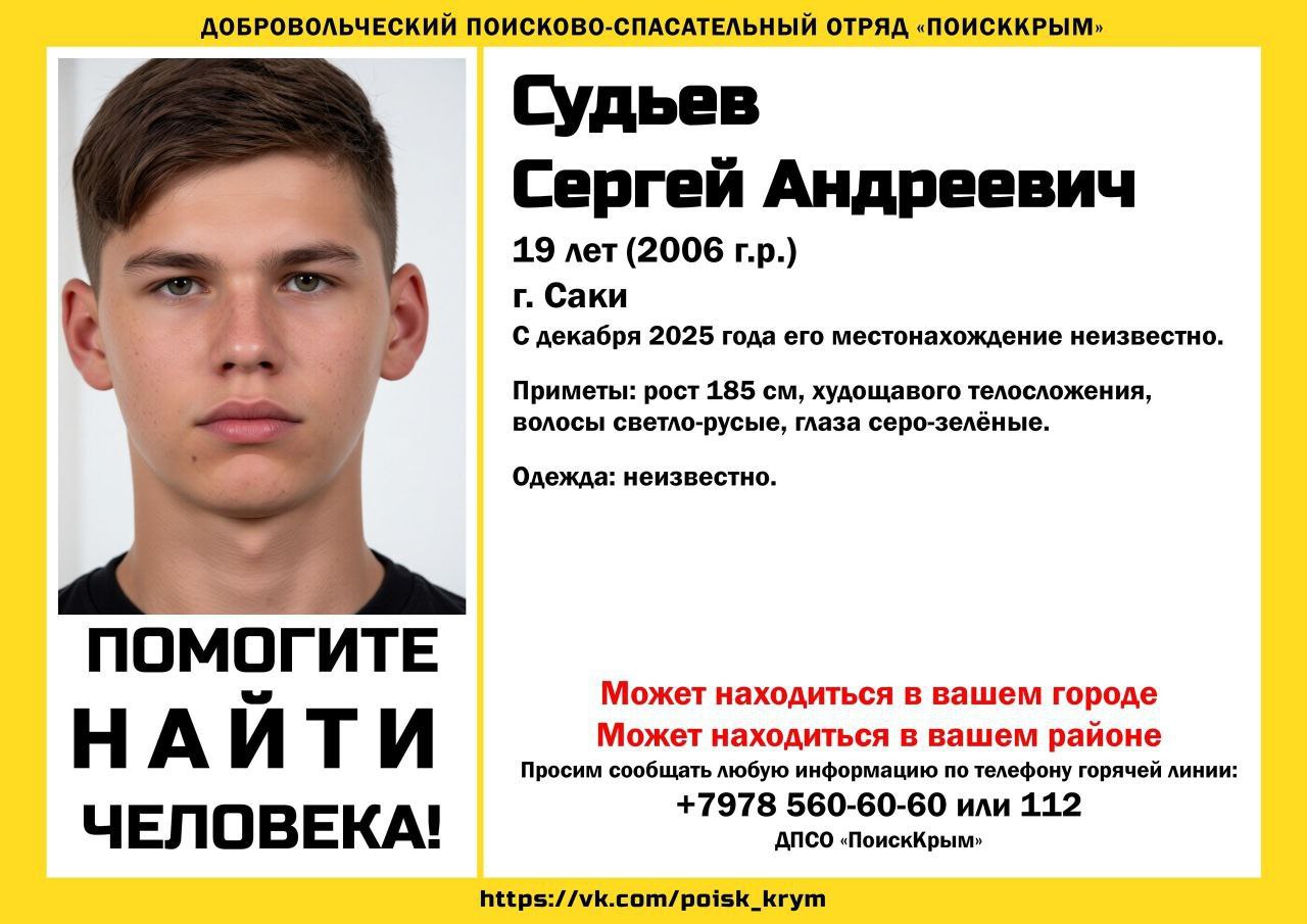 С декабря 2025 года местонахождение 19-летнего жителя города Саки Судьева Сергея Андреевича остается неизвестным.