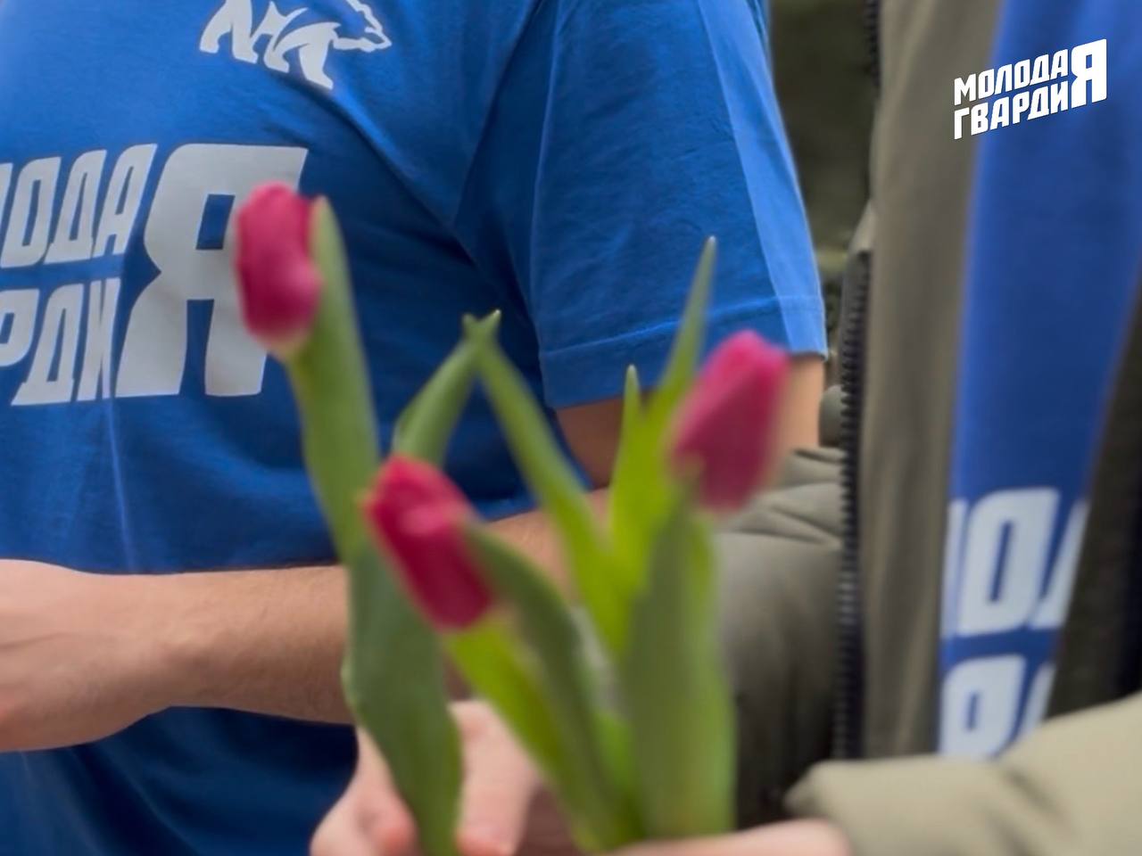 Молодогвардейцы дарили женщинам символ весны — яркие тюльпаны, а вместе с ними — тёплые слова благодарности, улыбки и праздничное настроение.