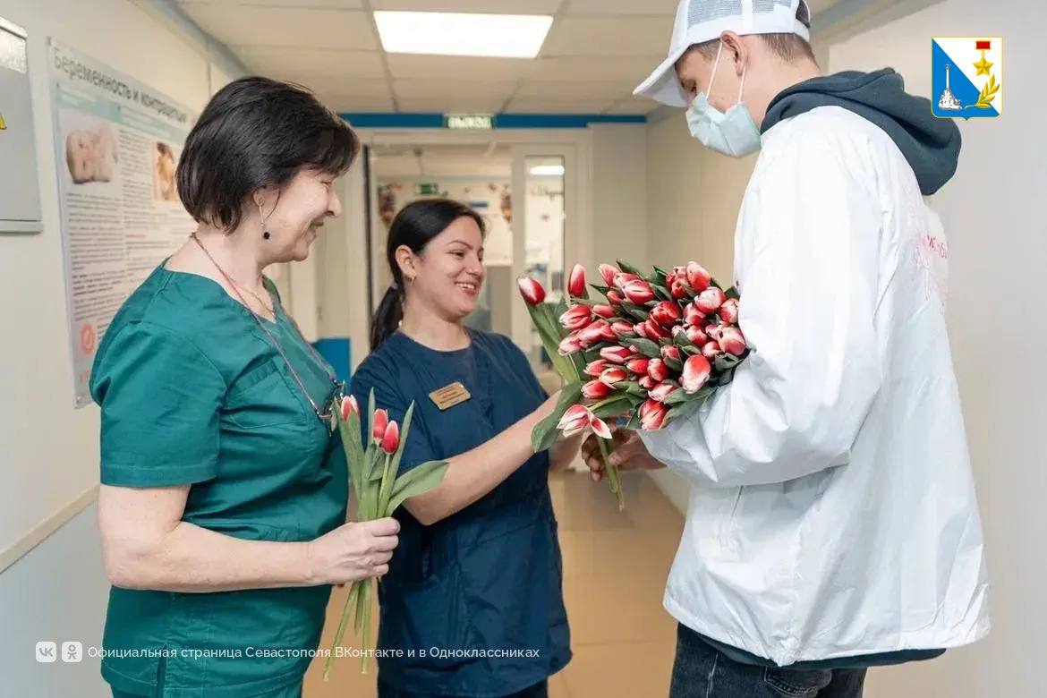 Ребята приехали в центр крови и родильный дом, чтобы поздравить тех, кто работает в праздник. Навестили ветеранов Великой Отечественной войны и семьи участников СВО. Девушки на вокзале и площади Нахимова тоже улыбались благодаря юношам с охапками весенних цветов.