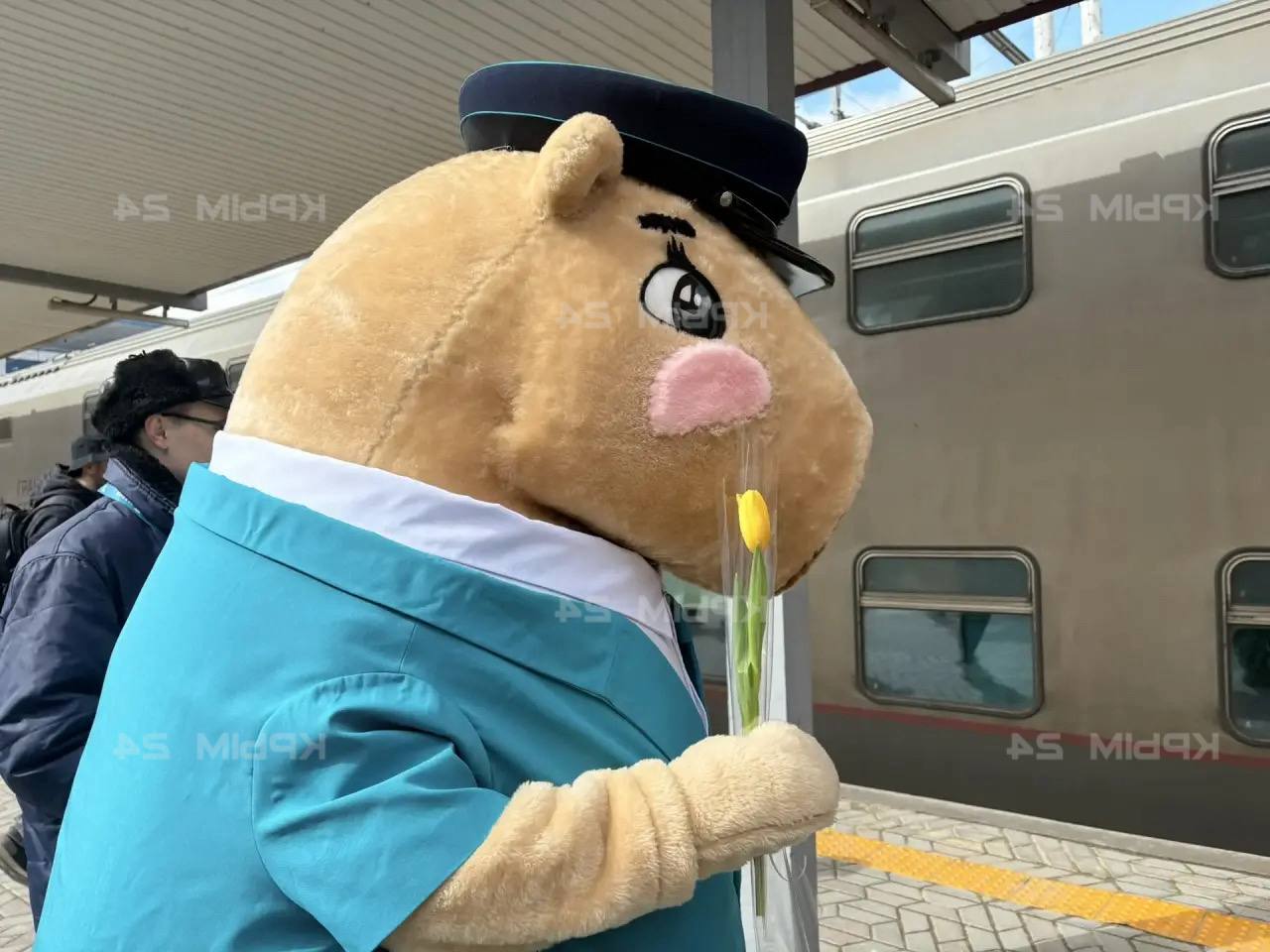 Весна пришла в Крым: На вокзале Симферополя женщинам копибара дарит тюльпаны