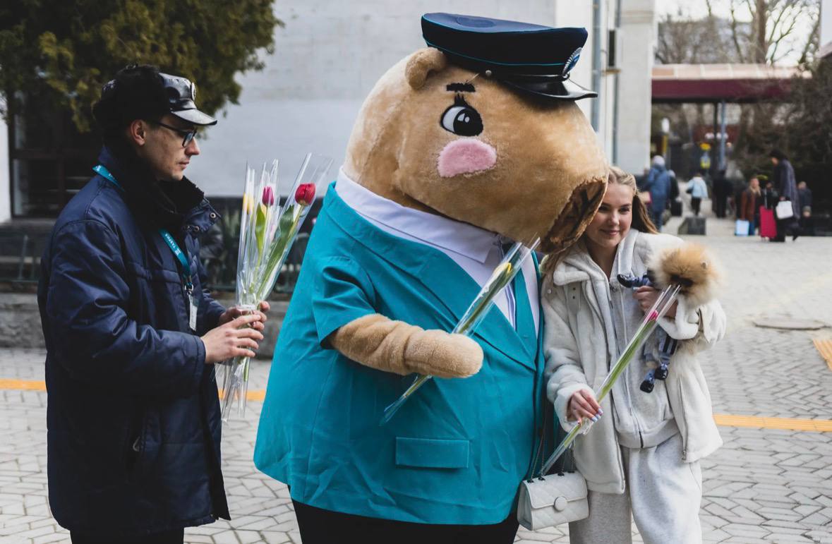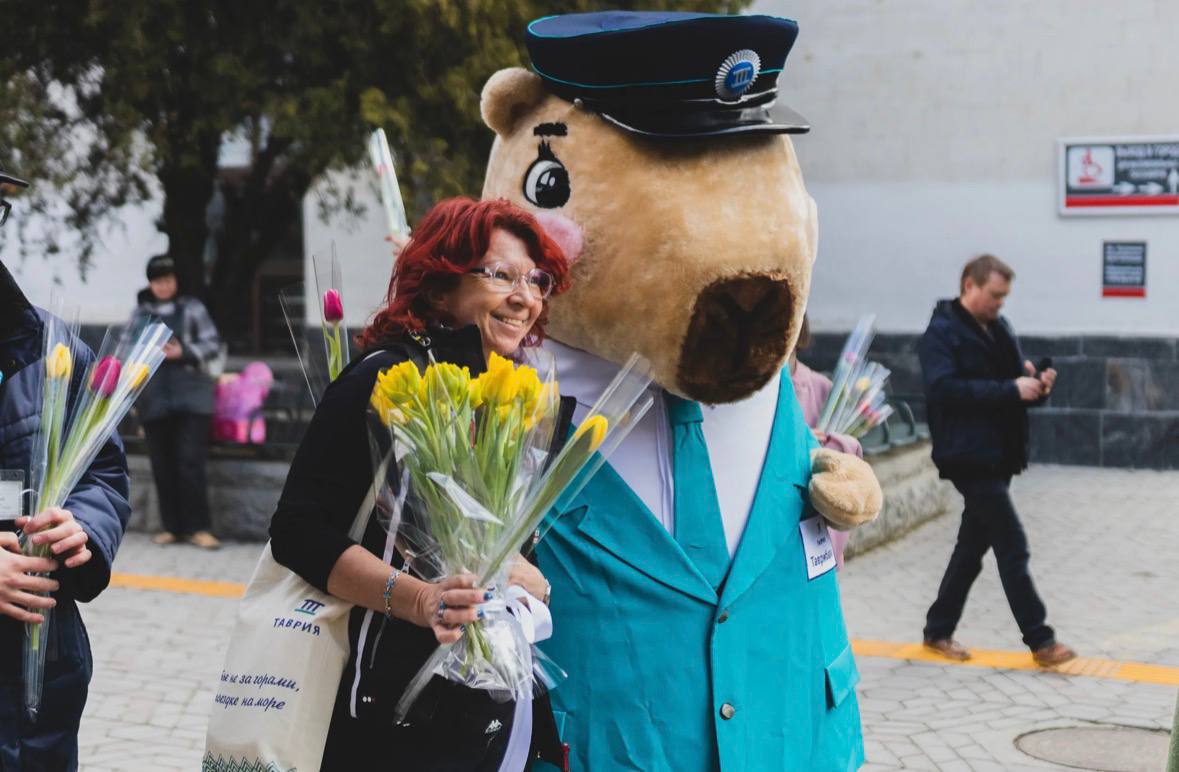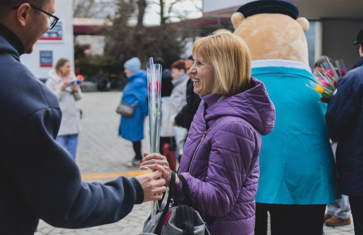 Прибывшим в Крым пассажиркам поездов подарили тюльпаны в честь 8 Марта.