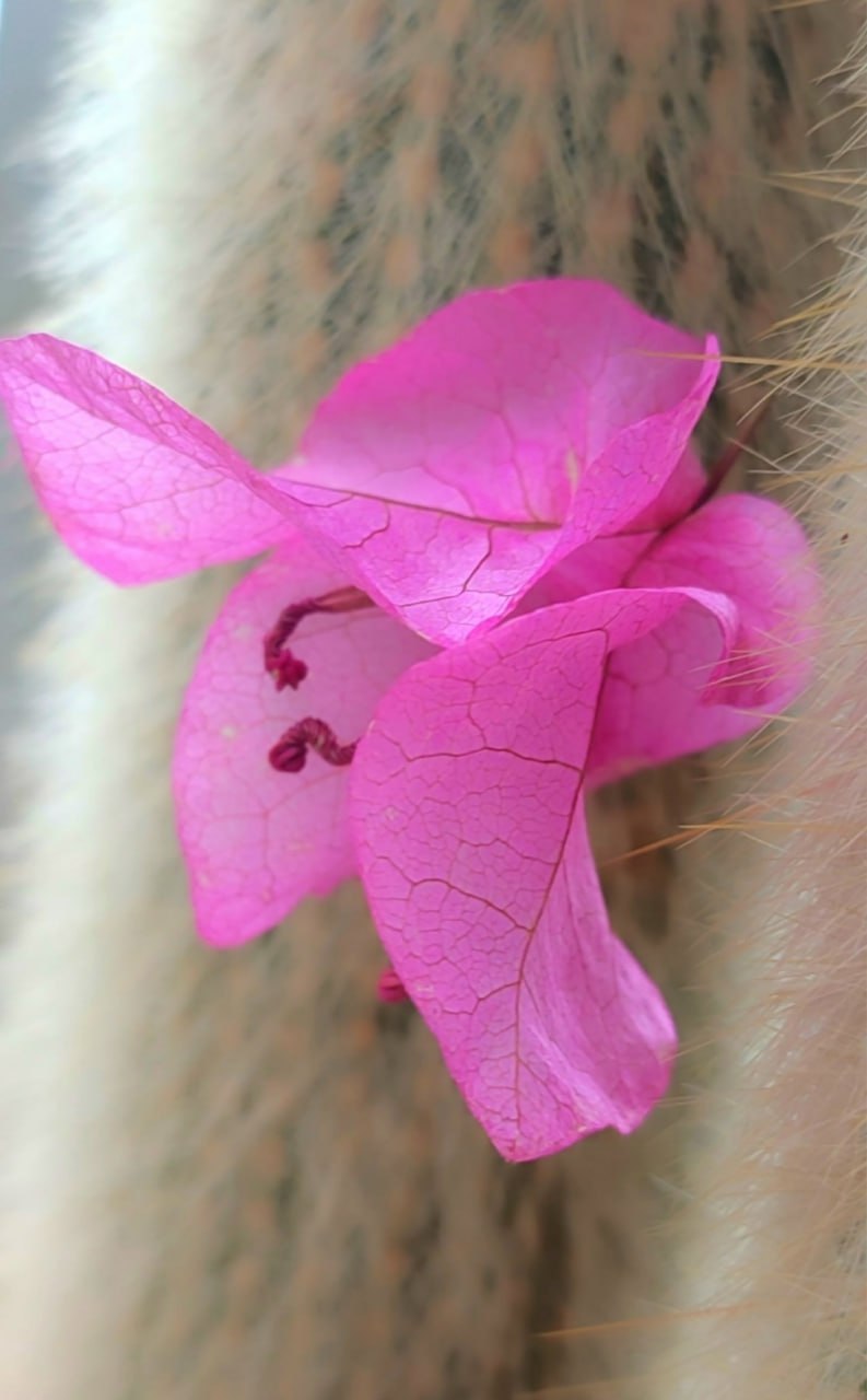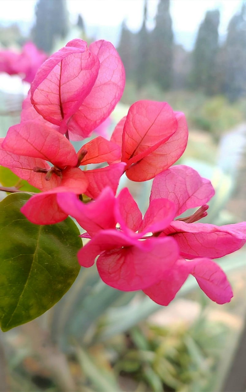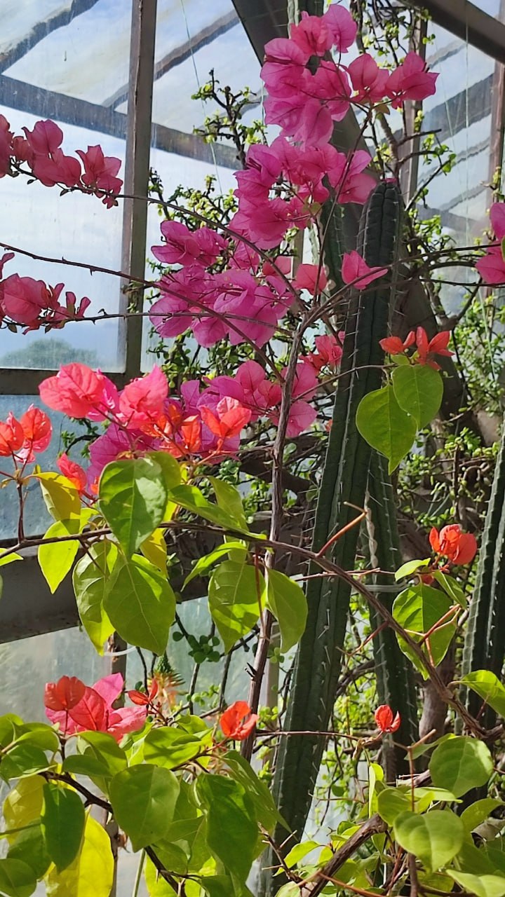 Это бугенвиллея. И она сейчас цветёт в Кактусовой оранжерее Никитского ботанического сада. Те, кто любят все оттенки розового, оценят атмосферу