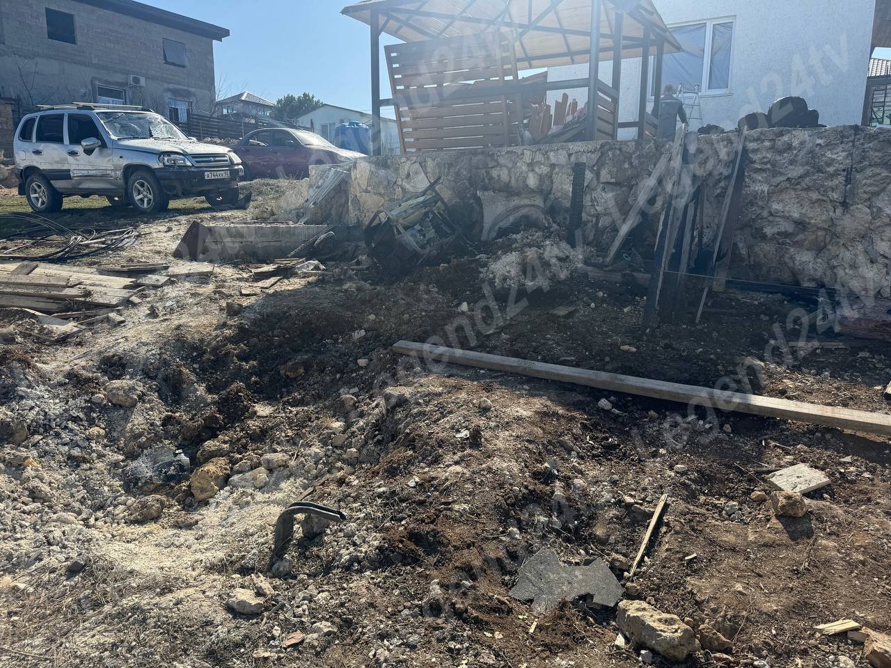 Сбитый беспилотник упал на территорию частного дома в СТ «Гранат». Он был начинён поражающими элементами – металлическими шариками и взрывчаткой, повреждены 2 автомобиля, цистерна с водой, выворочен забор, выбиты стекла, стена внутри дома дала трещину.