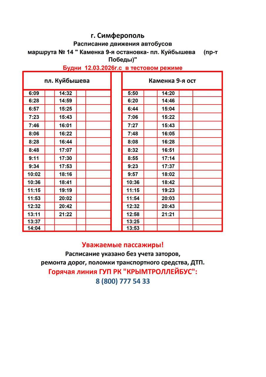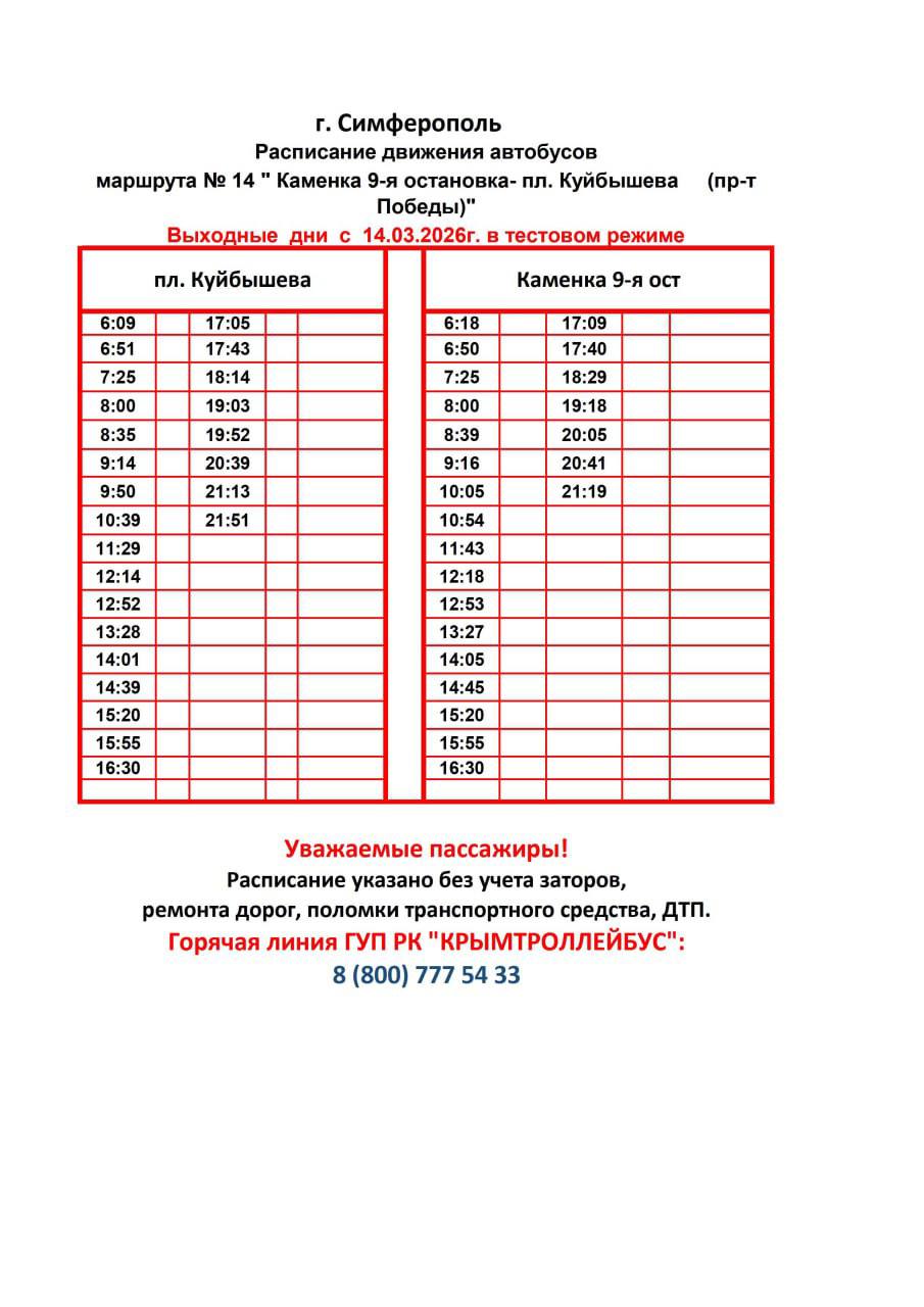 Обращаем Ваше внимание, что с 12 марта, с целью улучшения транспортной доступности, на автобусных маршрутах №14 "Каменка 9-я остановка- пл. Куйбышева (пр-т Победы)" и №88 "п.Кирпичный-Каменка 1-я остановка" вступают в силу новые расписания движения по будним и выходным дням.