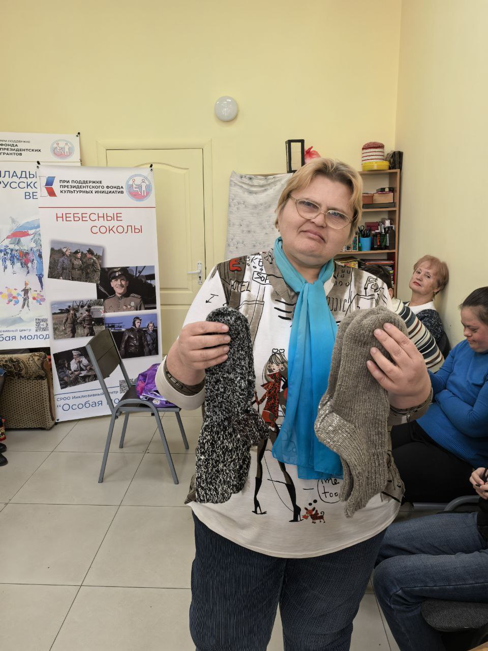 Сегодня ребята показали целый концерт: пели песни, читали стихи, играли на разных инструментах. Это действительно уникальное объединение, где люди с непростой судьбой могут выразить себя в творчестве, общаться и развивать свои умения. Так, одна из девушек - мастерица вязания. Она создает носки и другие изделия для наших бойцов и попросила передать их на передовую. Обязательно выполню ее просьбу.