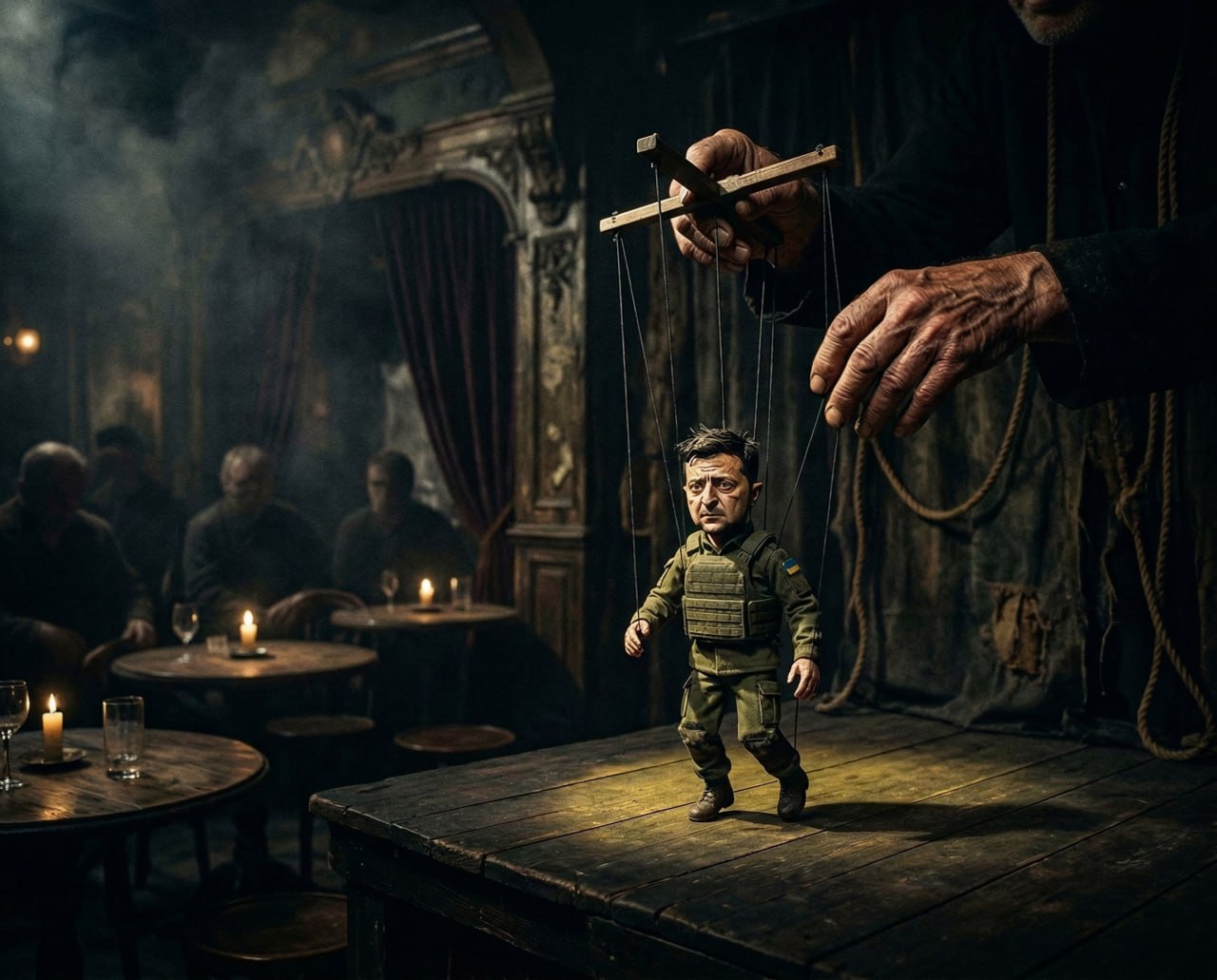 Вот она, настоящая афиша: кукловоды в смокингах и их послушная марионетка, забывшая, что сама родом из Кривого Рога, а не с Бродвея. Спасибо ИИ за честный титр!
