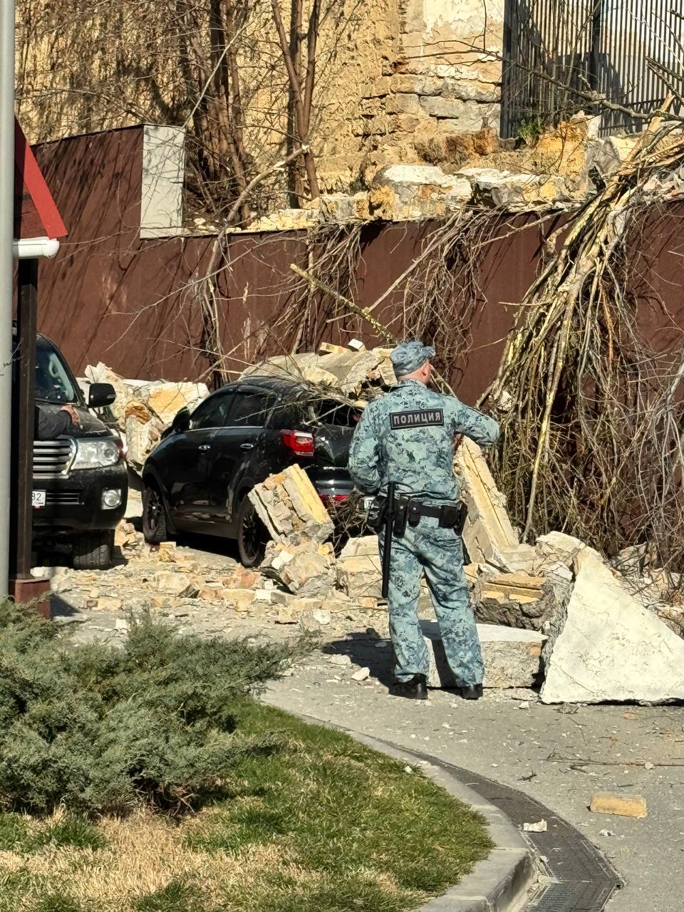 На улице Битакской в Симферополе часть каменного забора рухнула на припаркованные автомобили