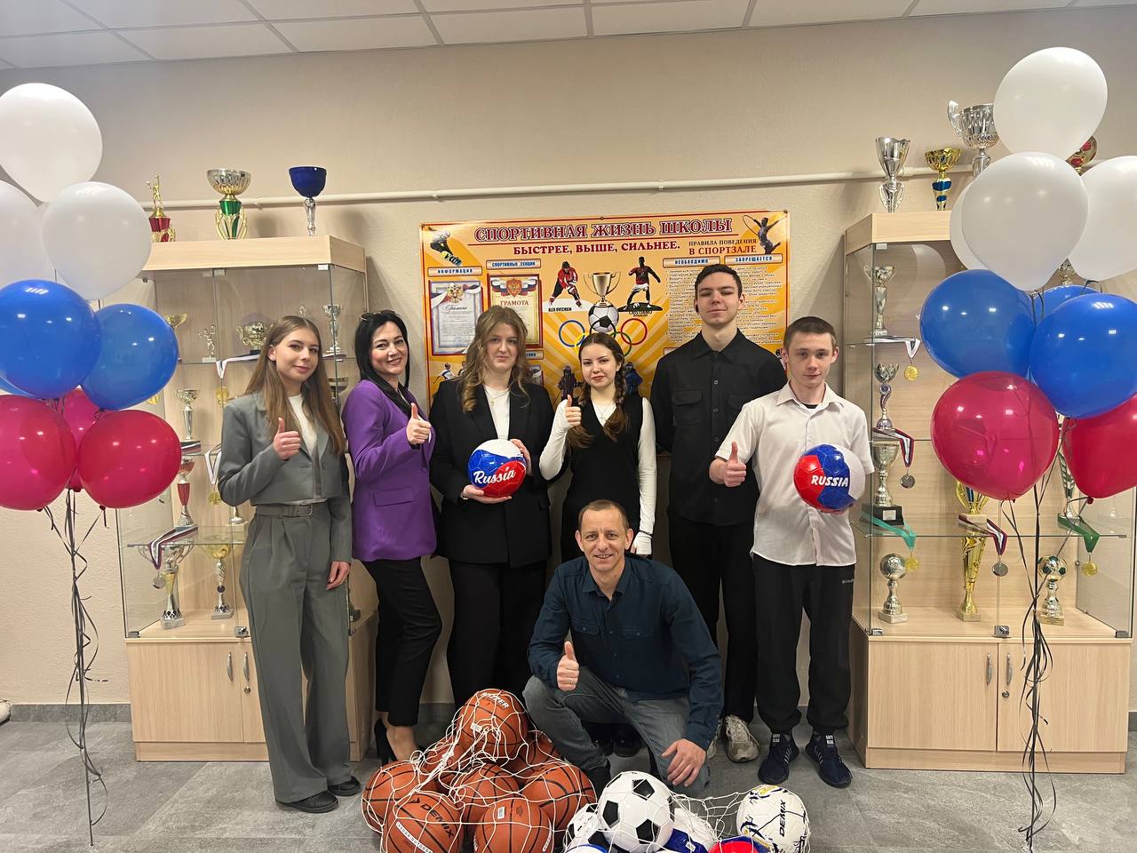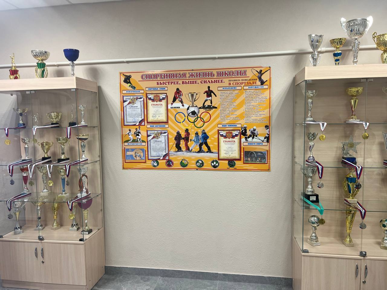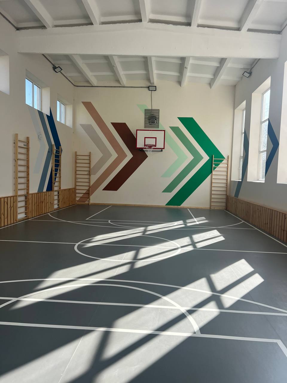 Но главное украшение зала — это, конечно, новое спортивное оборудование: баскетбольные щиты, шведские стенки, гимнастические скамейки, мячи и другое.