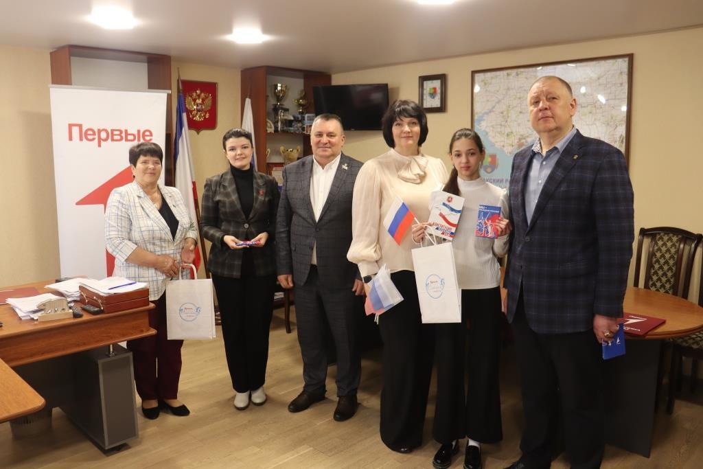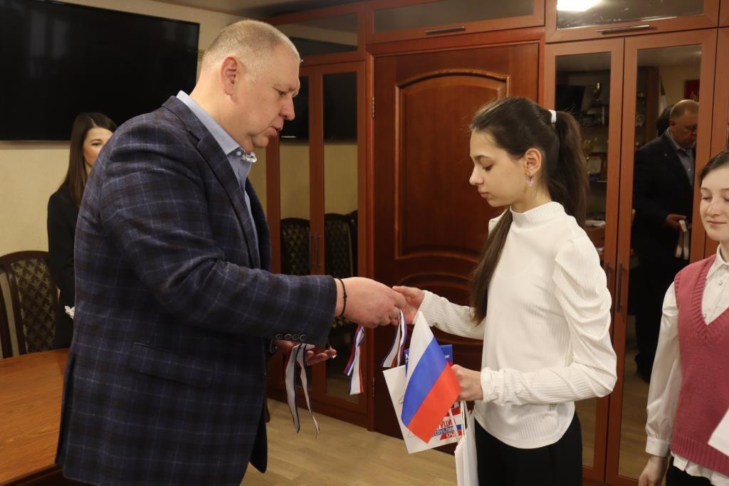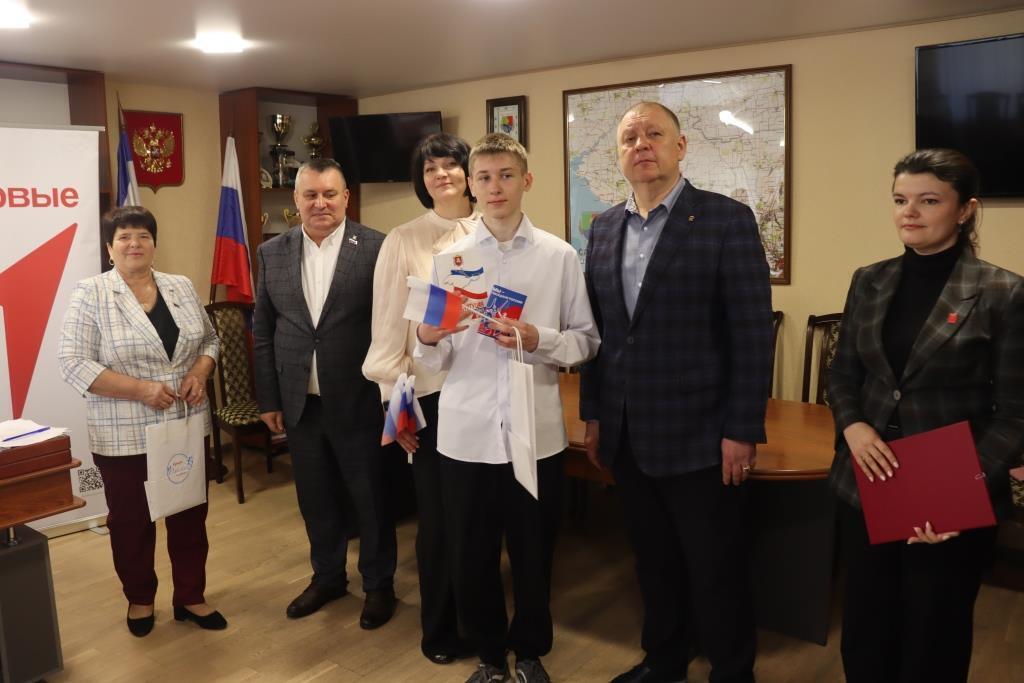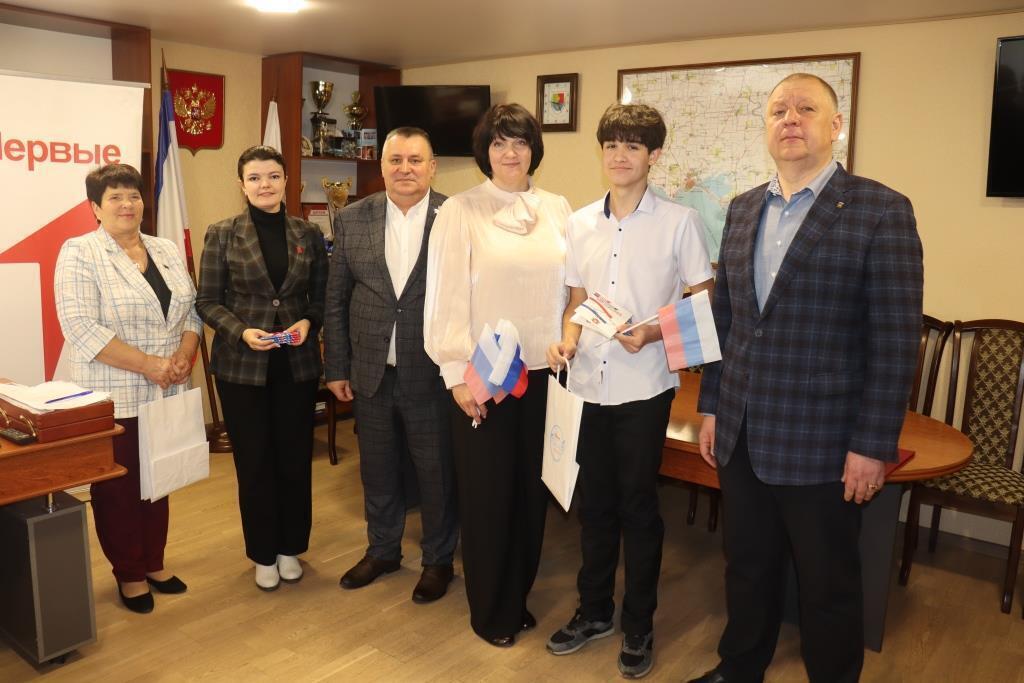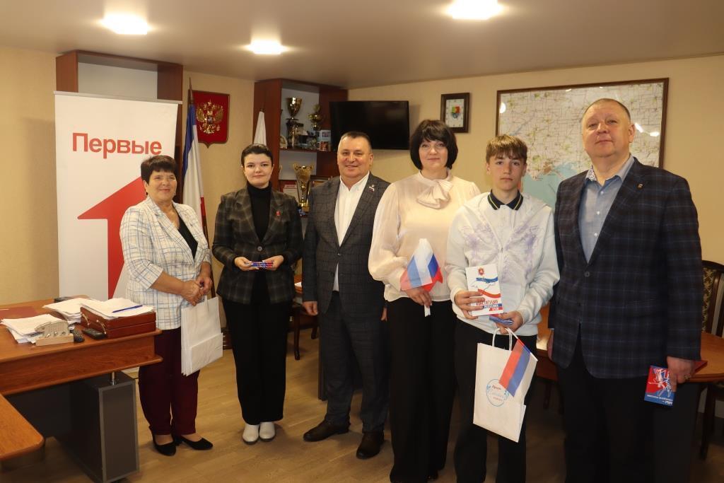 Заместитель главы администрации Сакского района Игорь Никуленков и председатель Сакского районного совета Михаил Слободяник наградили активистов Движения Первых значками с символикой Движения и вручили «Конституцию Республики Крым», поздравили ребят с получением главного документа гражданина России.