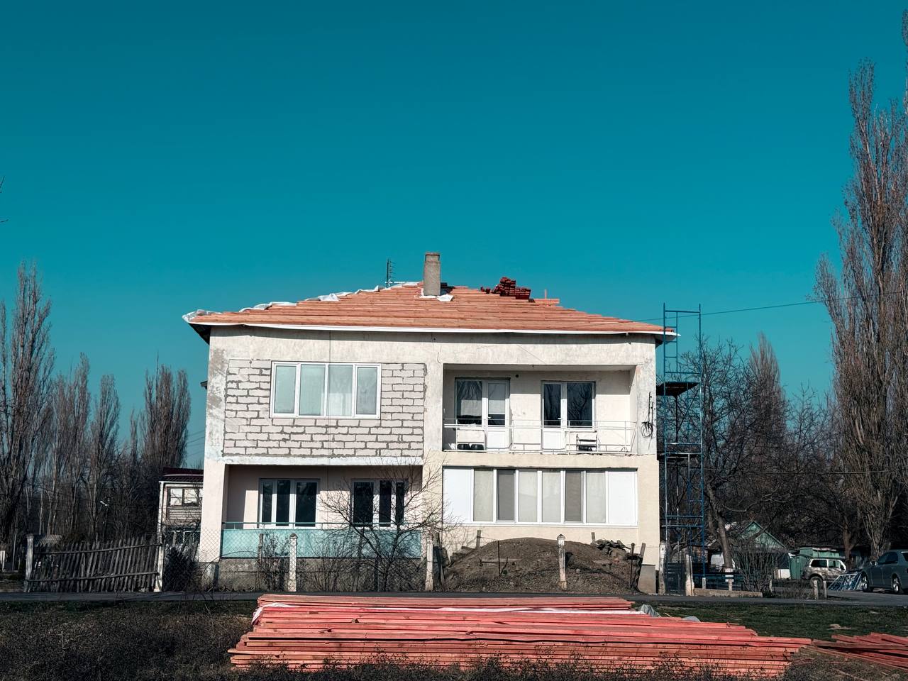 В настоящее время делается обрешетка с гидробарьером. Далее будет укладка металлочерепицы, монтаж водосточной системы и ограждения.