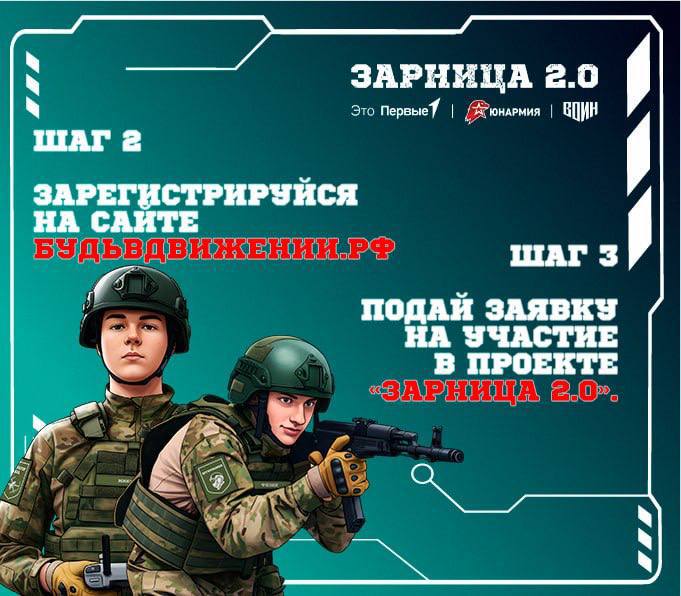 — подай заявку на участие в проекте «Зарница 2.0» зарница.будьвдвижении.рф;