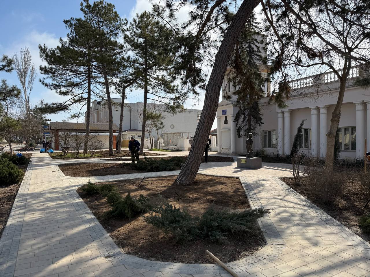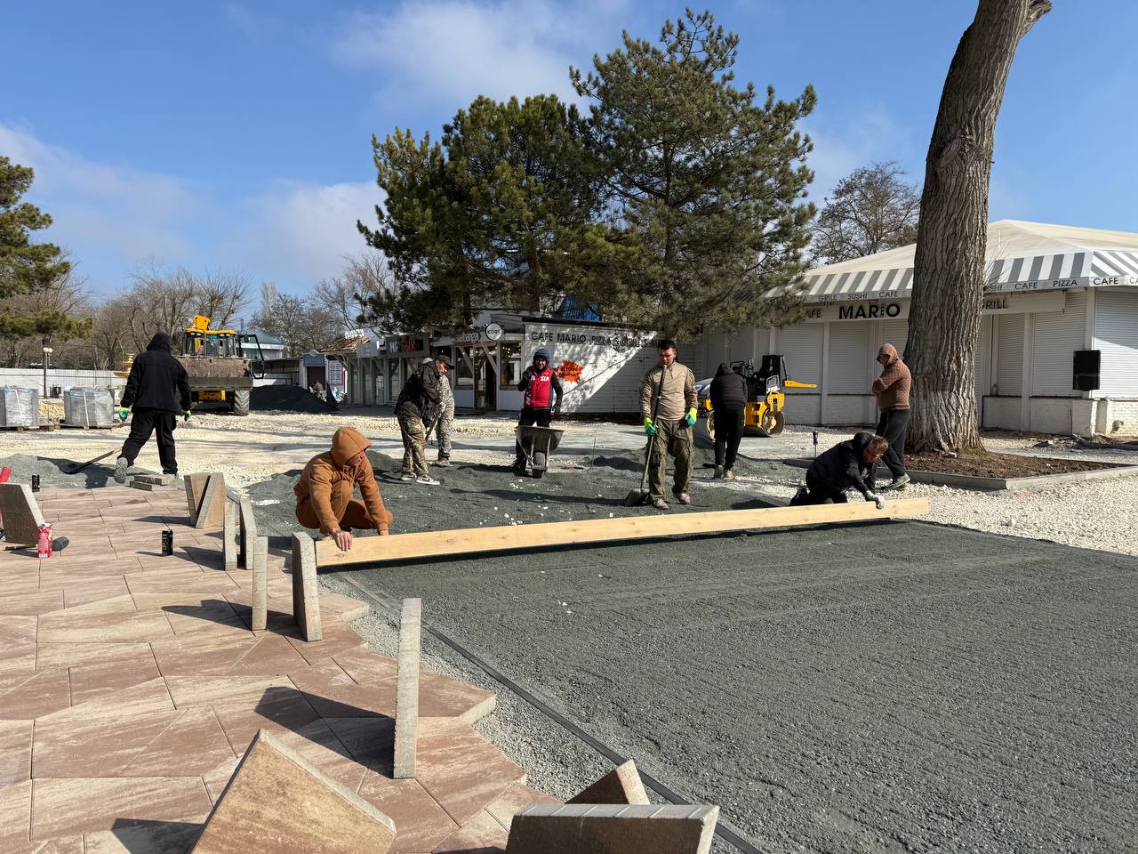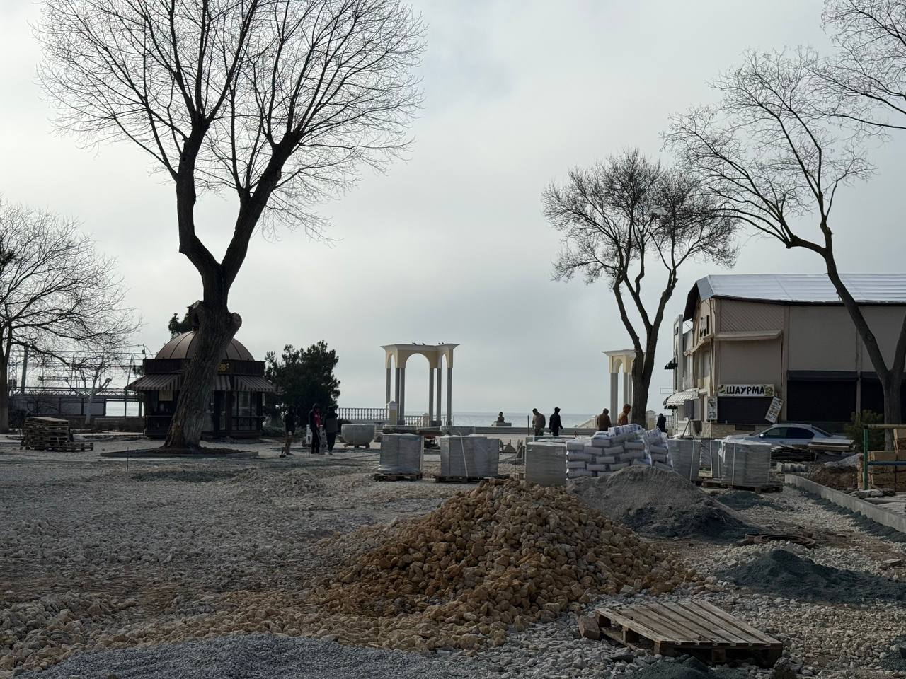 Сейчас на набережной укладывают тротуарную плитку, прокладывают капельный полив, реставрируют фонтан, выравнивают грунт в зоне озеленения. Сегодня трудится 40 человек, задействовано 9 единиц техники.